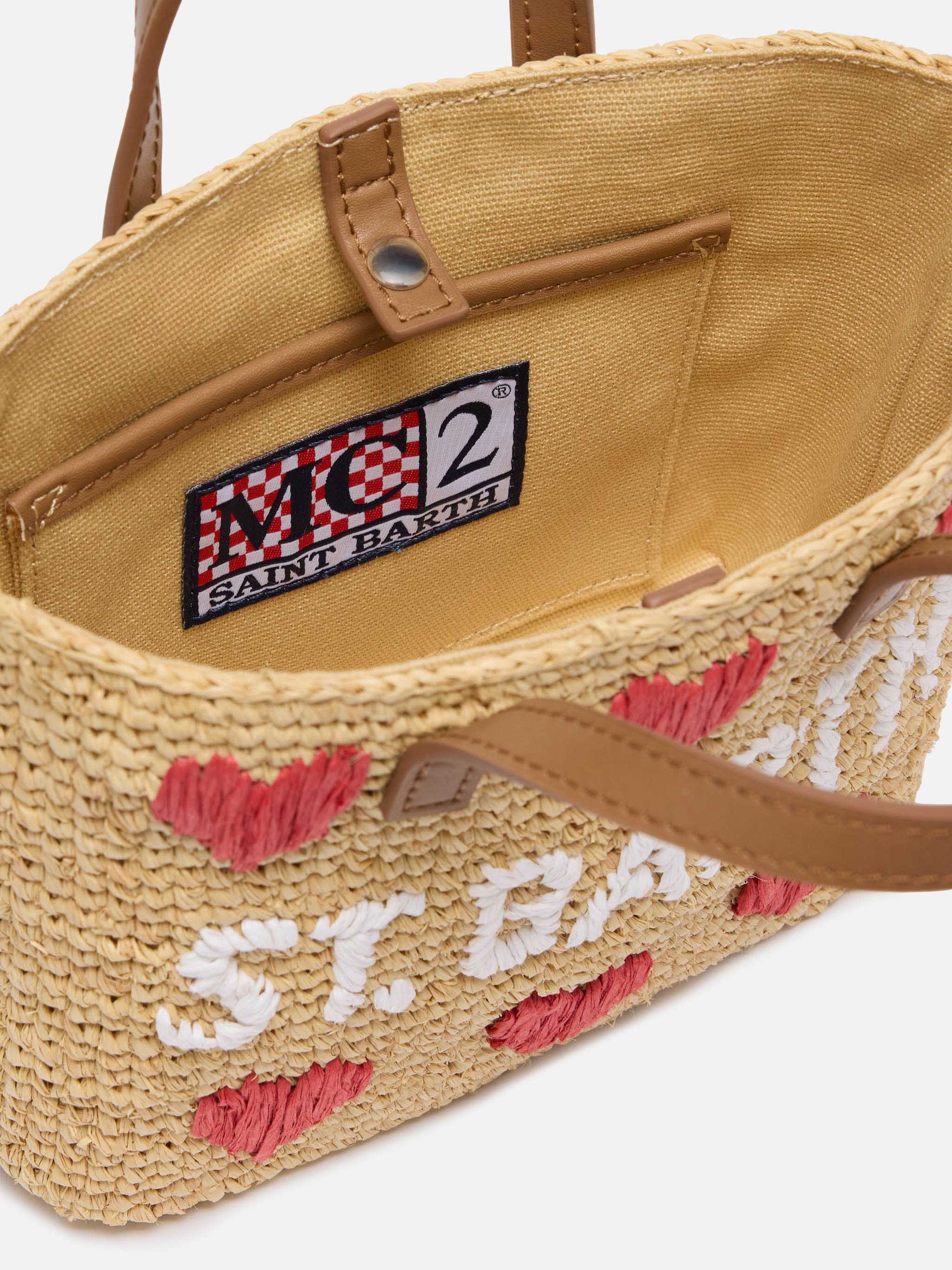 Beige Raffia City Mini-Tasche mit Herzstickerei