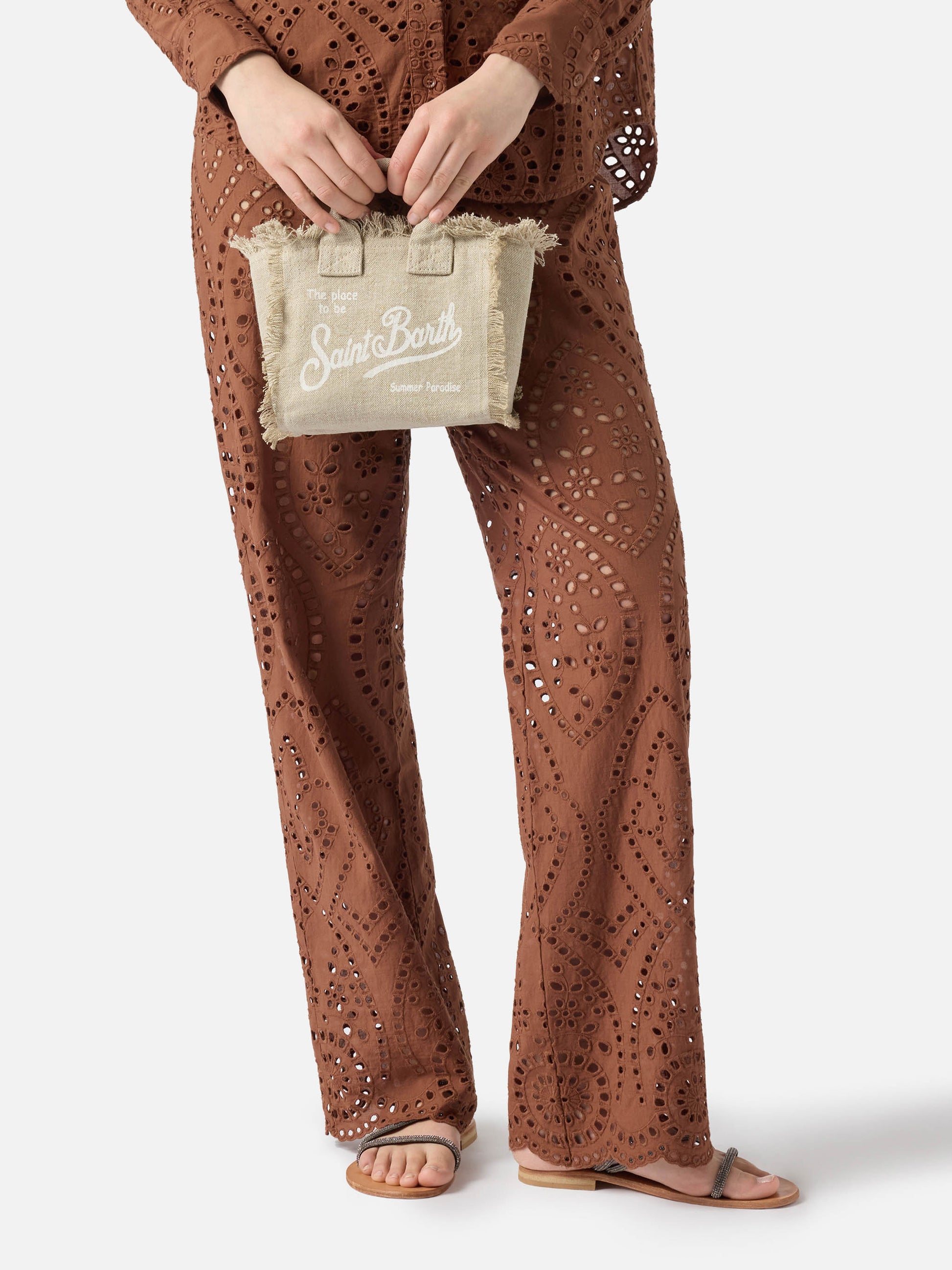 Beige solid color linen Vanity mini bag with removable strap