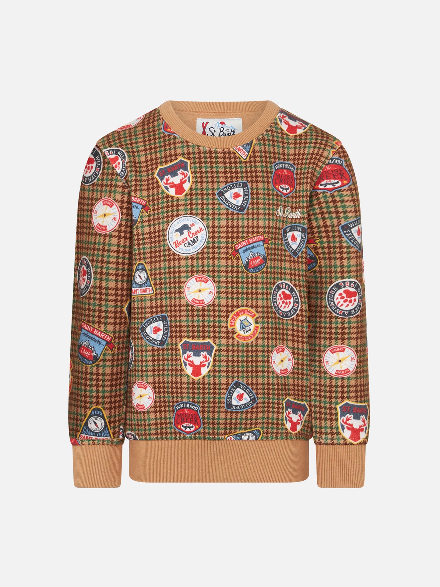 Jungen-Sweatshirt mit Rundhalsausschnitt, Aufnähern und Pied-de-Poule-Print