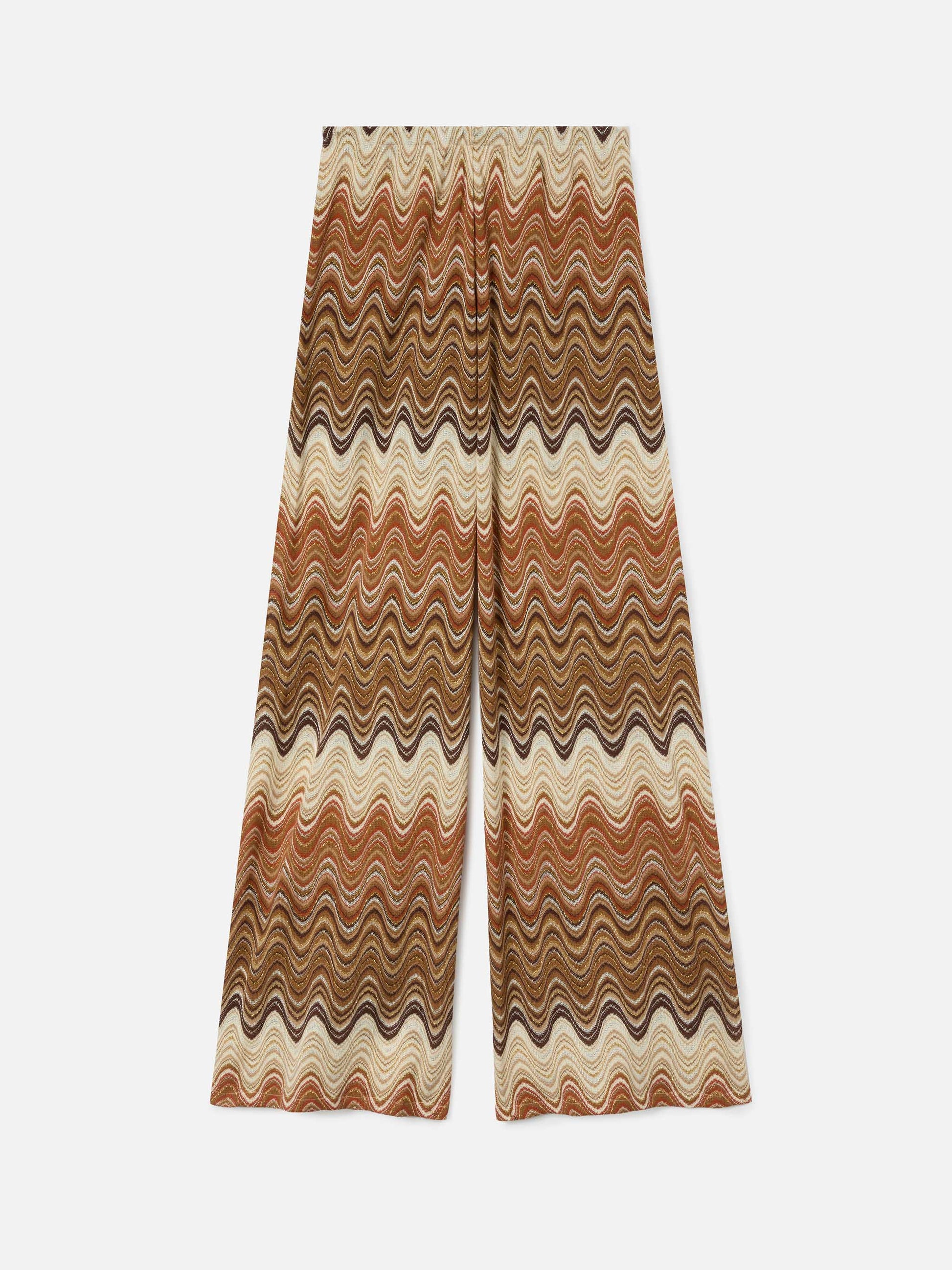 The Amalia long pants are made from raschel knit, lightweight and elastic, designed to offer comfort and freedom of movement. The design with a wave pattern in shades of brown defines the garment with a distinctive graphic aesthetic. The model features an elasticated waistband that ensures a comfortable and natural fit, while lurex details add a luminous accent. The wide-leg line with regular waist guarantees a relaxed fit.