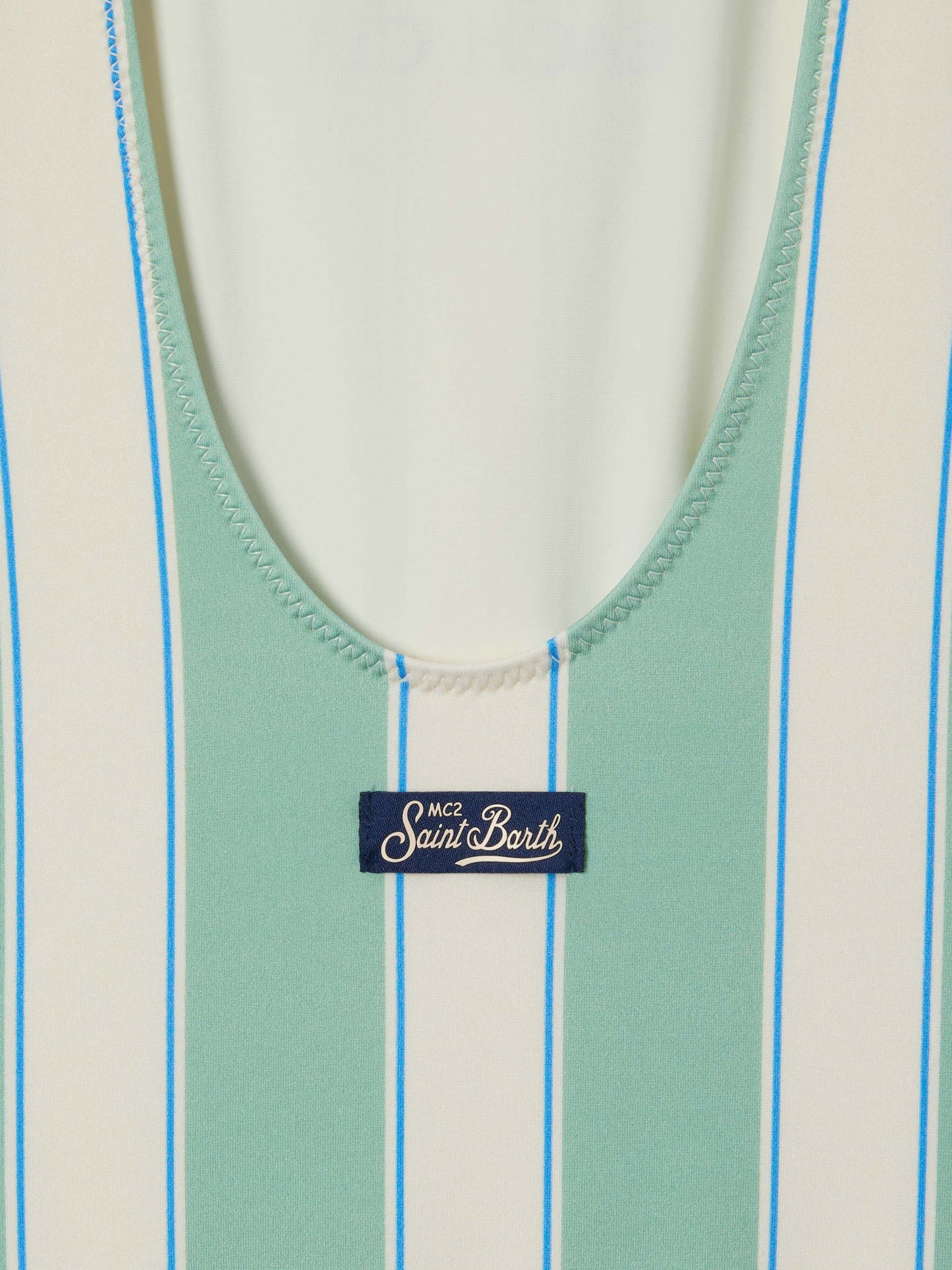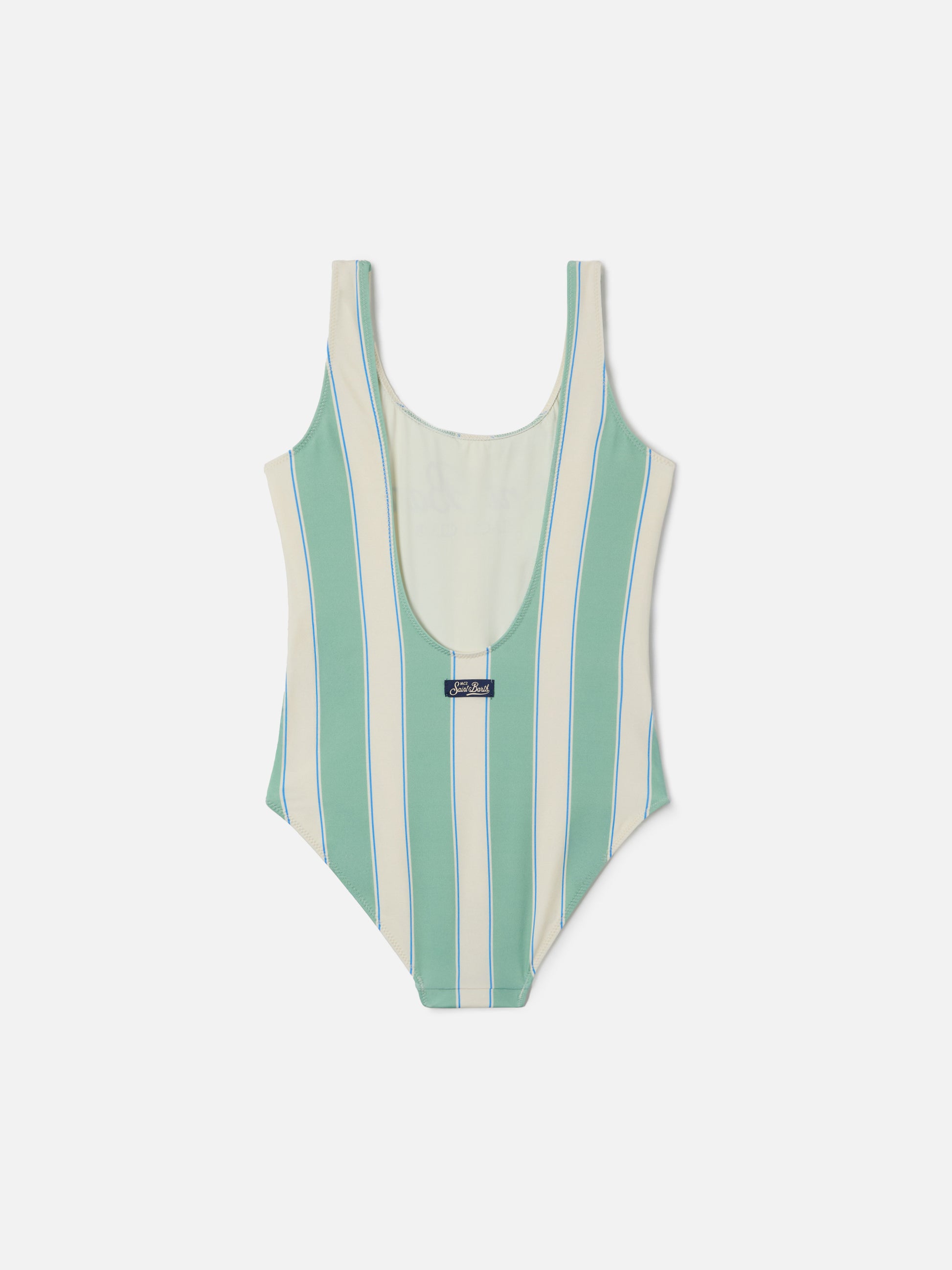 Cara green and white striped one-piece swimsuit with Beach Club print