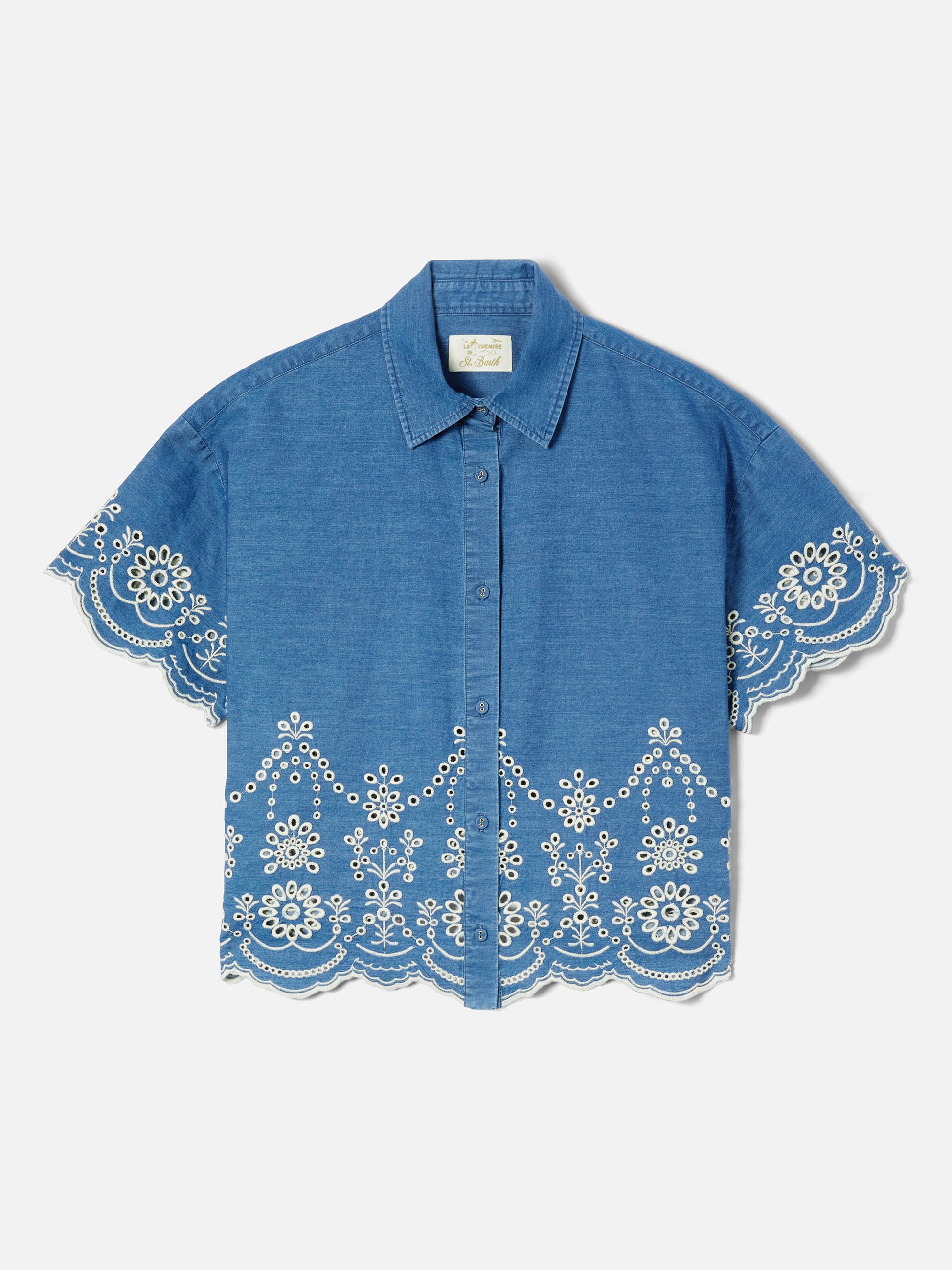 Clementine short-sleeve chambray shirt with floral embroidery