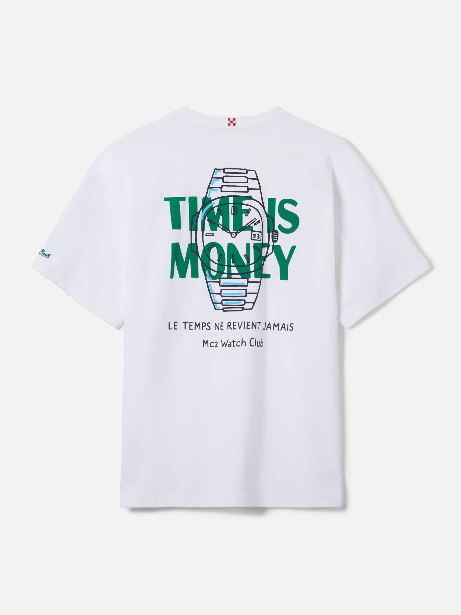https://it.mc2saintbarth.com/de/products/delmar-t-shirt-with-time-is-money-print-and-maxi-graphic-on-the-back10775856742746Delmar t-shirt with Time Is Money print and maxi graphic on the back79.00https:files/UID_DLR000101605L-MAN-T-SHIRT-WHITE-MC2-MC2_5.jpghttps:files/UID_DLR000101605L-MAN-T-SHIRT-WHITE-MC2-MC2_5.jpgEURInStockT-SHIRT650948215130Alle Produkte – nur von Man649134276954AVADA - Bestseller647472087386Bedruckte T-Shirts288164774072T-Shirts für Herren621710016858Uhren aus Leidenschaft654690484570UpSelling_Man_T-ShirtsThe Delmar t-shirt is crafted from pure cotton, designed to provide comfort and a natural feel against the skin. The white solid-color design highlights the essential construction of the garment. The style features a Time Is Money in St. Barth print on the chest, while the back is enriched with a large graphic print featuring a watch and the Time Is Money lettering, completed by the phrases Le temps ne revient jamais and MC2 Watch Club. The garment is finished with a crew neck, short sleeves and a straight silhouette with a relaxed fit.