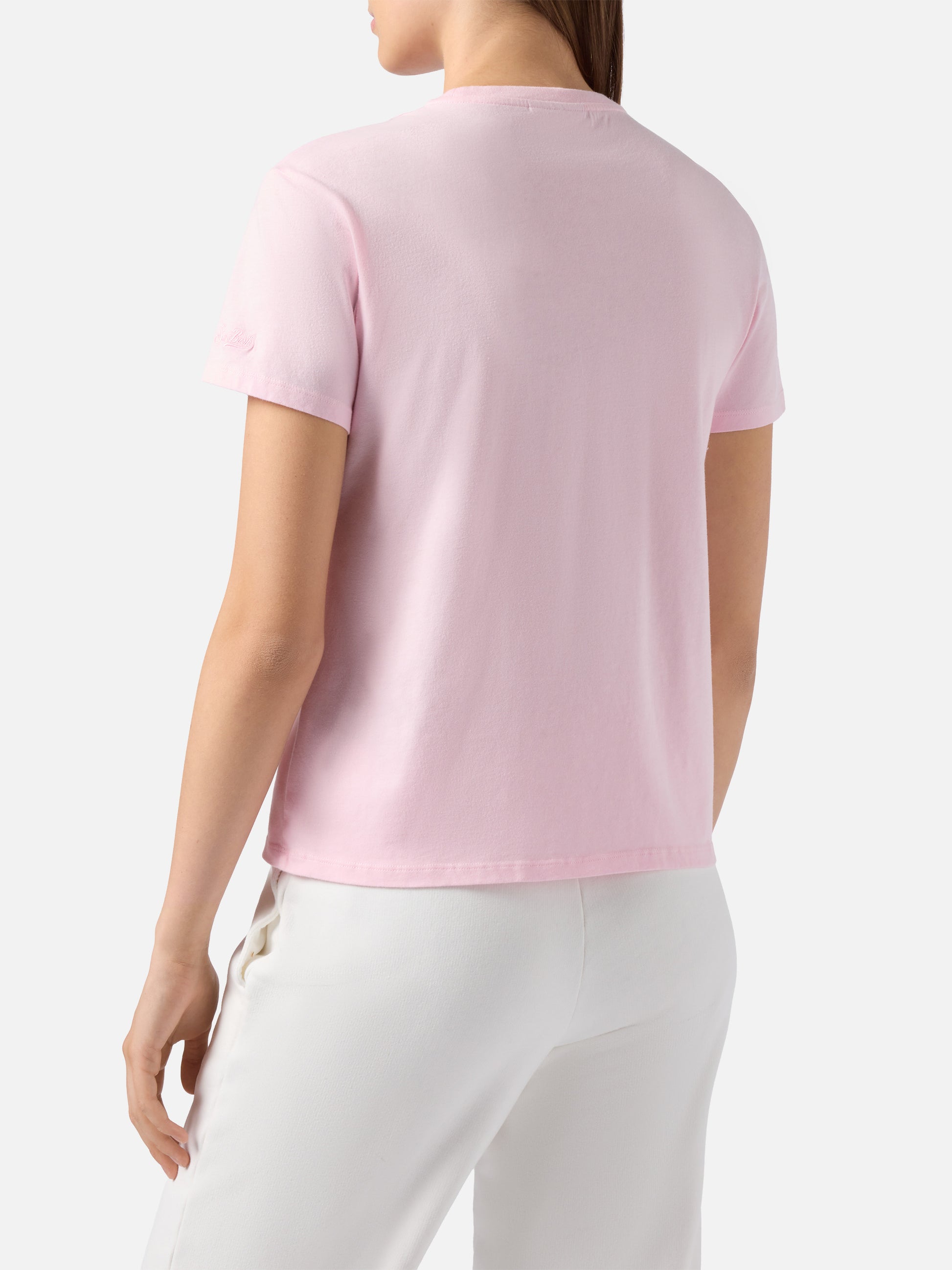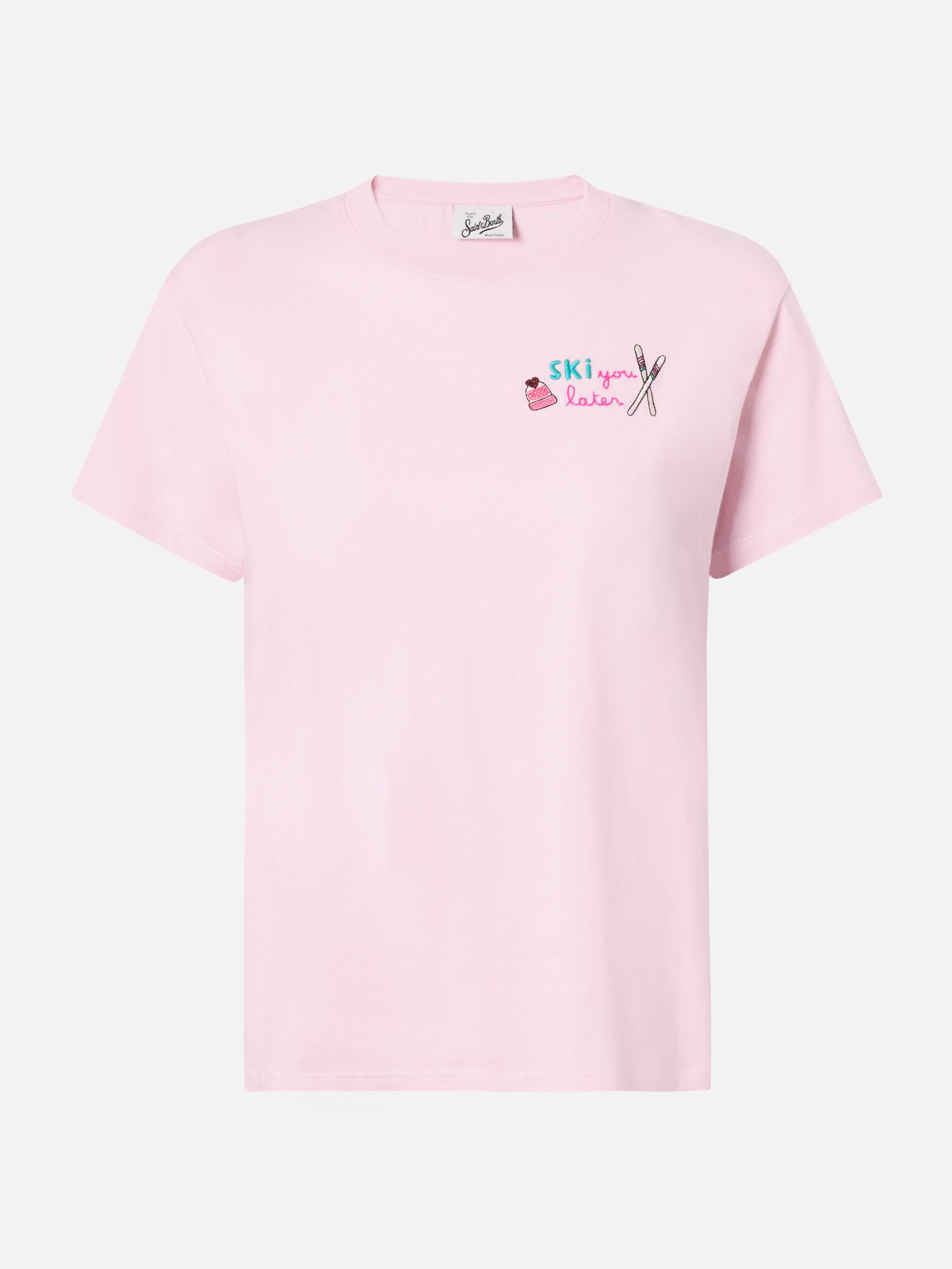 Emilie cotton T-shirt in pink with Ski you later embroidery