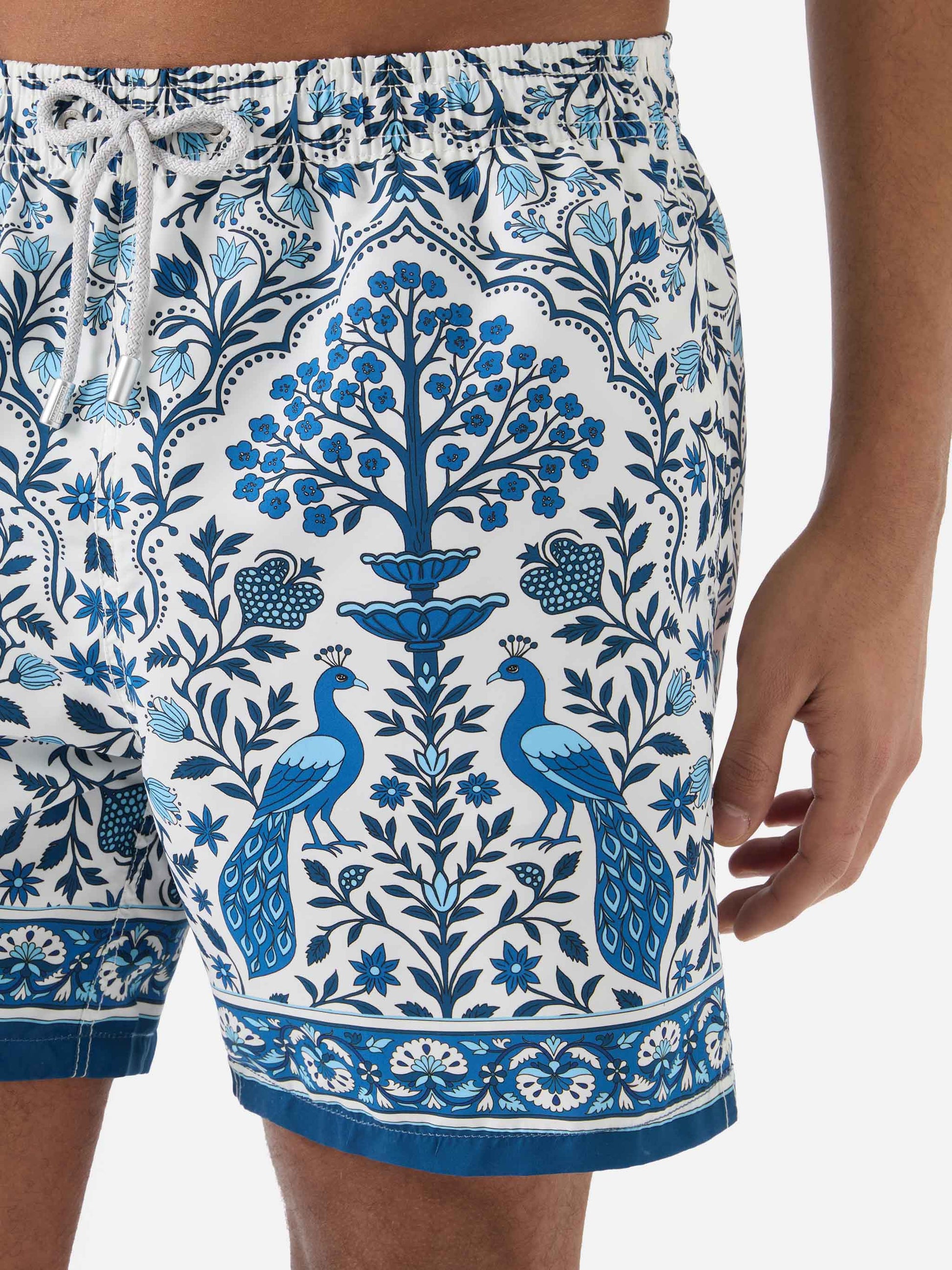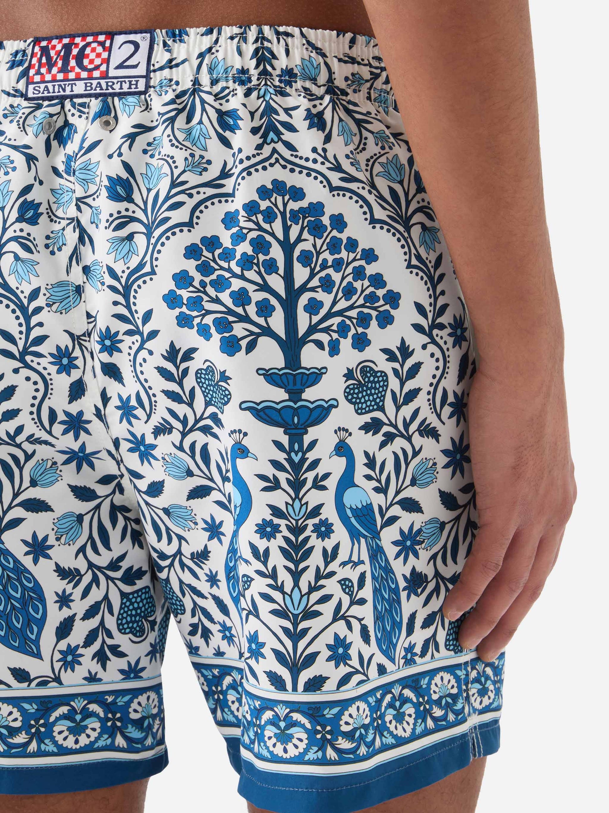 Gustavia white swim shorts with contrasting peacock print
