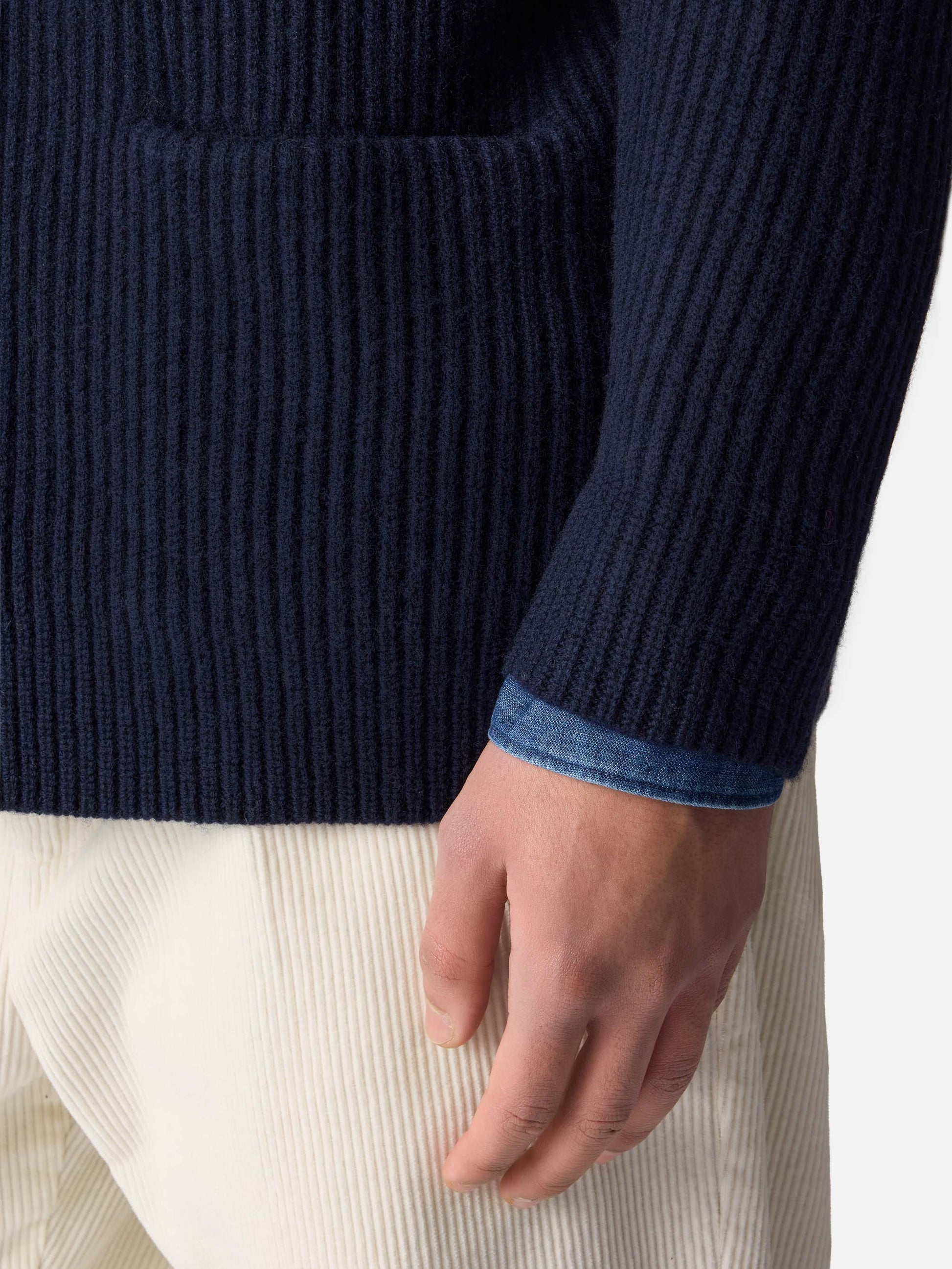 Blauer, gerippter Herren-Cardigan mit Schalkragen, Taschen und Aufnäher