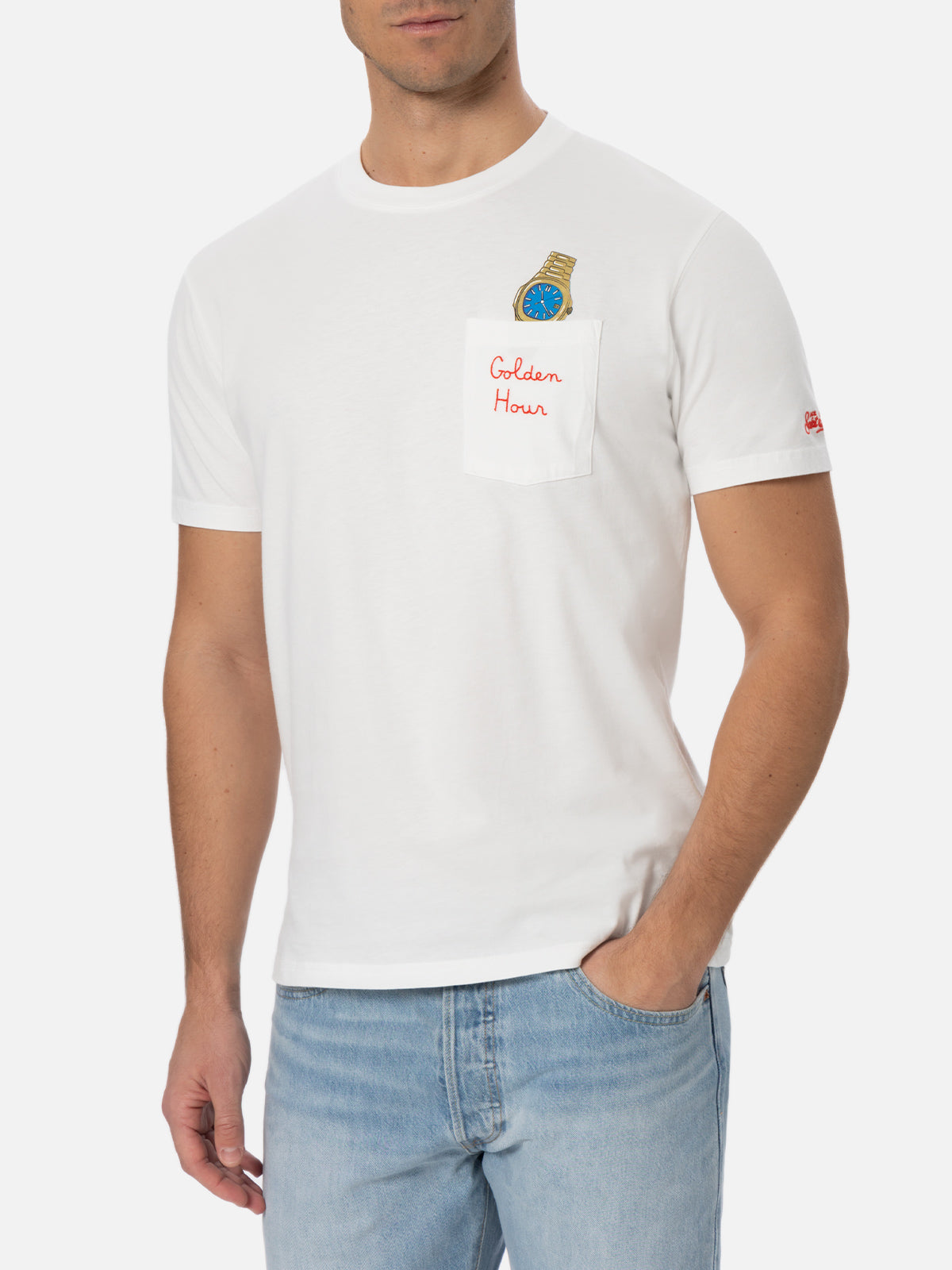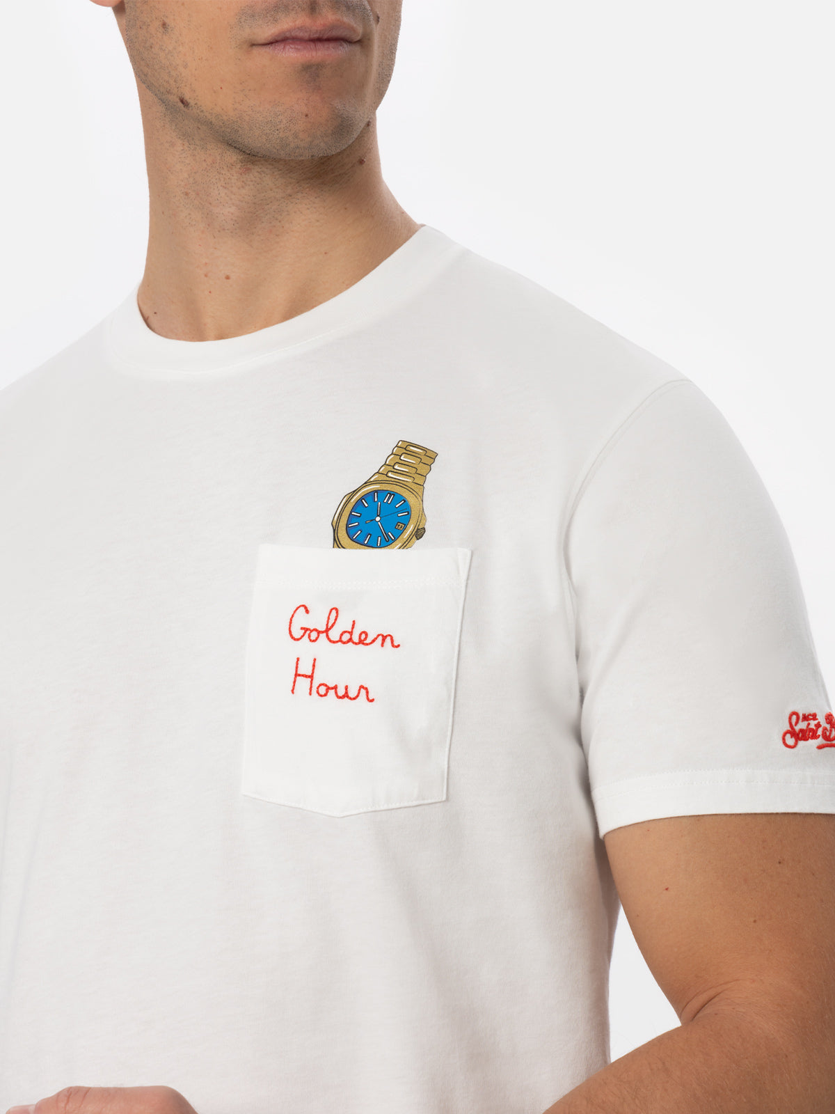 Weißes Baumwoll-T-Shirt für Herren „Connor“ mit „Golden Hour“-Stickerei