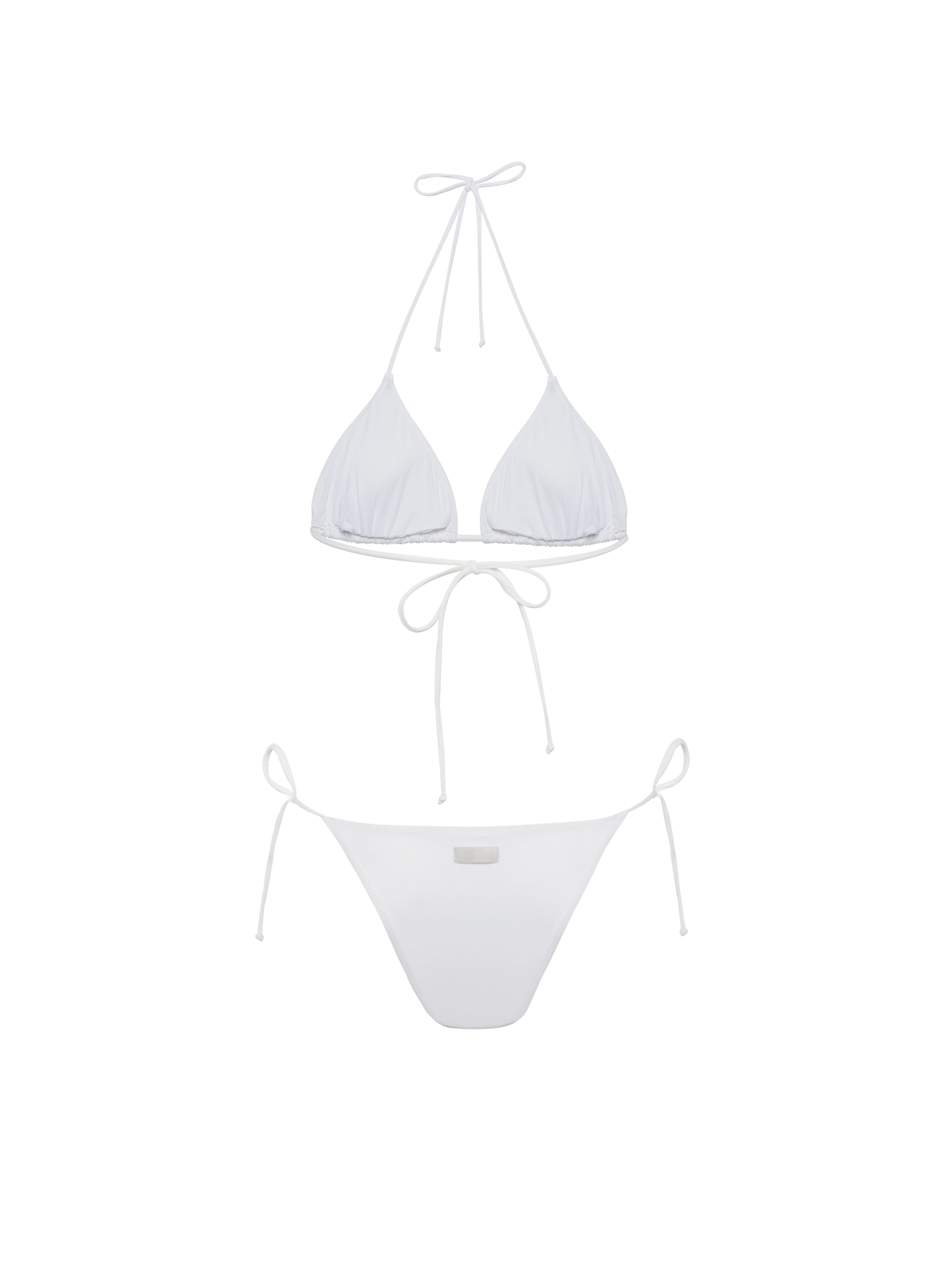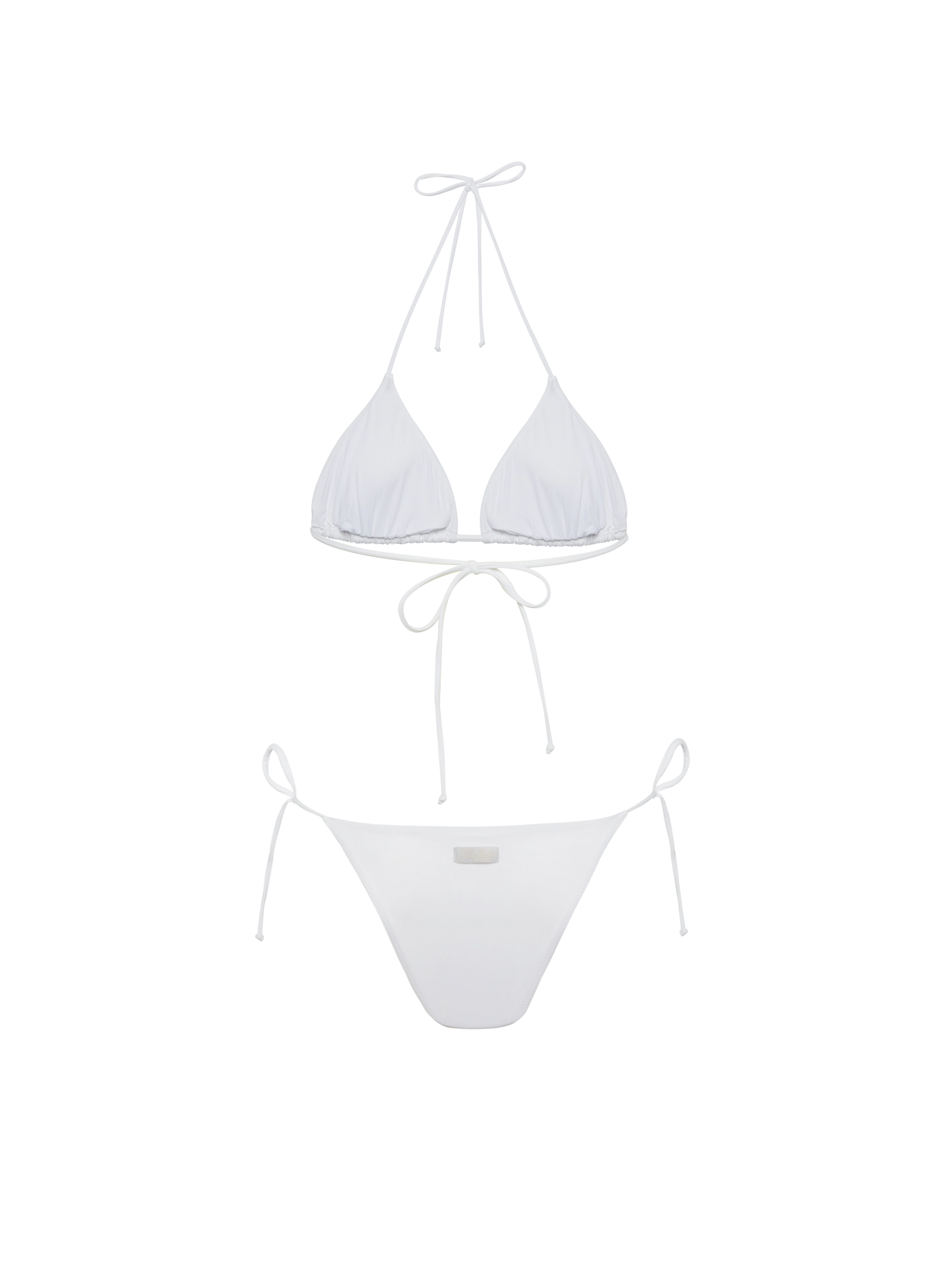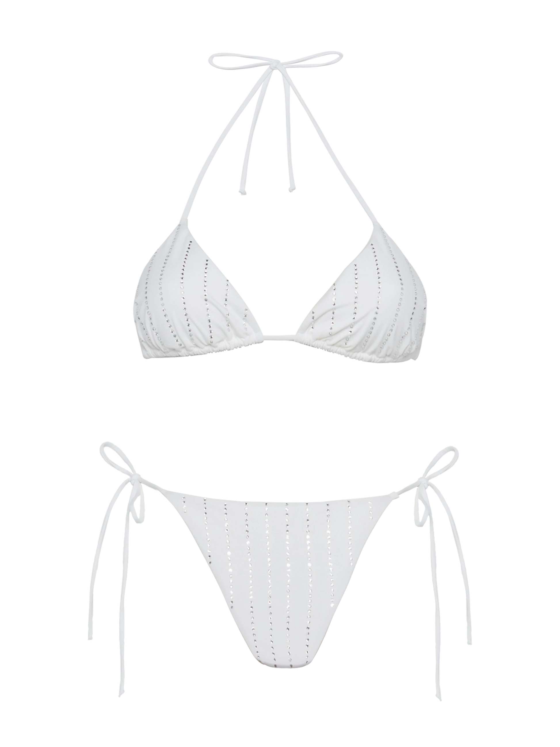 Klassische weiße Badehose „Marielle“ mit gestreifter Strassverzierung – Badeanzug „Leah“ mit Triangel-Oberteil und gestreifter Strassverzierung