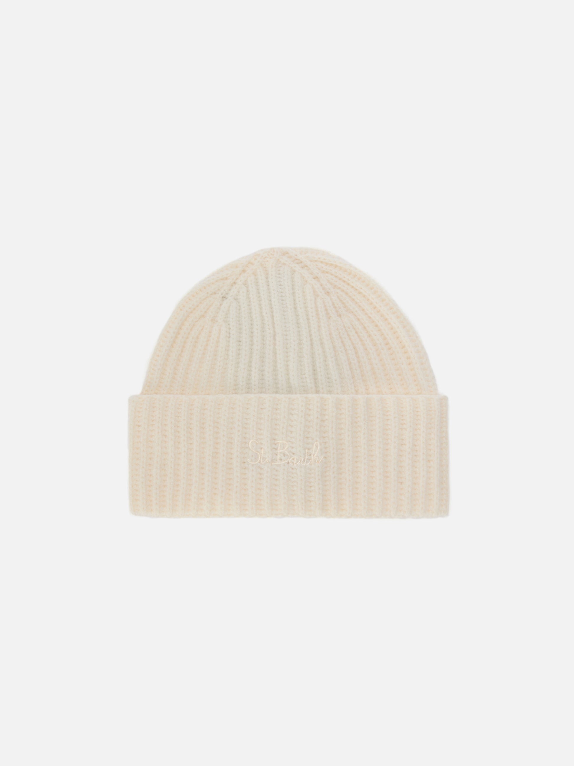 Moss Jr Beanie in white ribbed knit with St. Barth embroidery