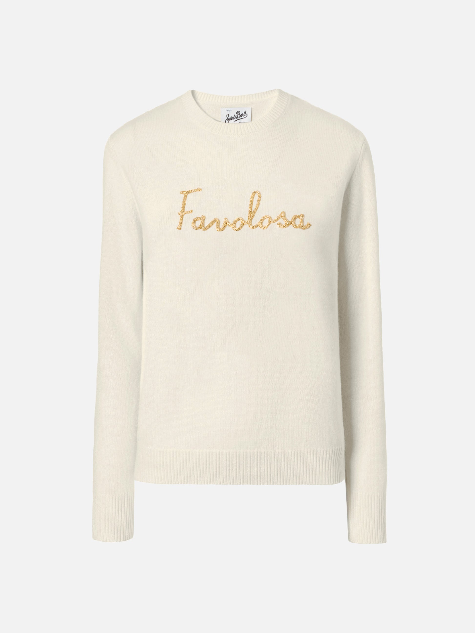 New Queen cashmere-blend sweater in white with Favolosa lurex embroidery