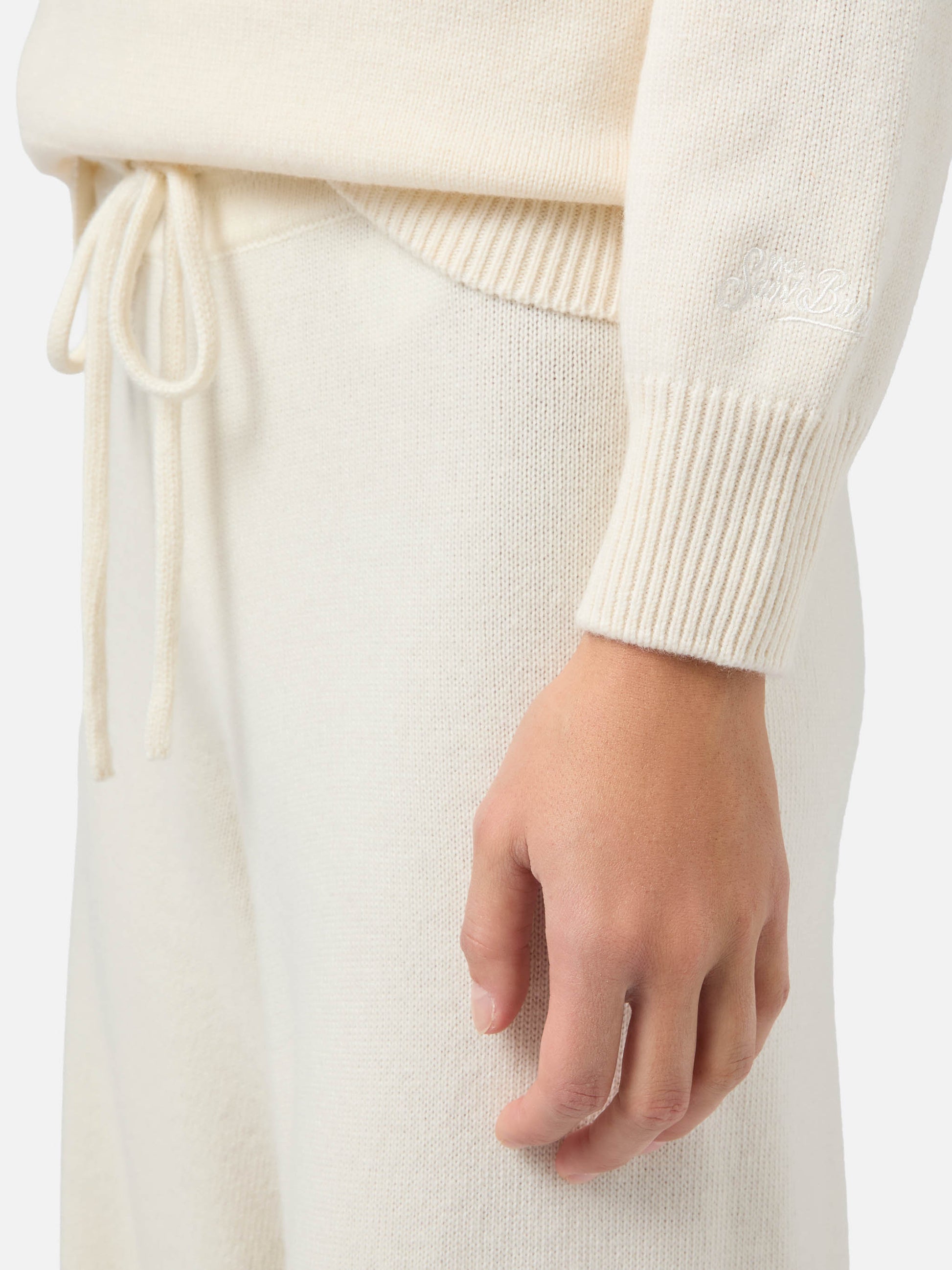 New Queen cashmere-blend sweater in white with Sono molto tonica embroidery