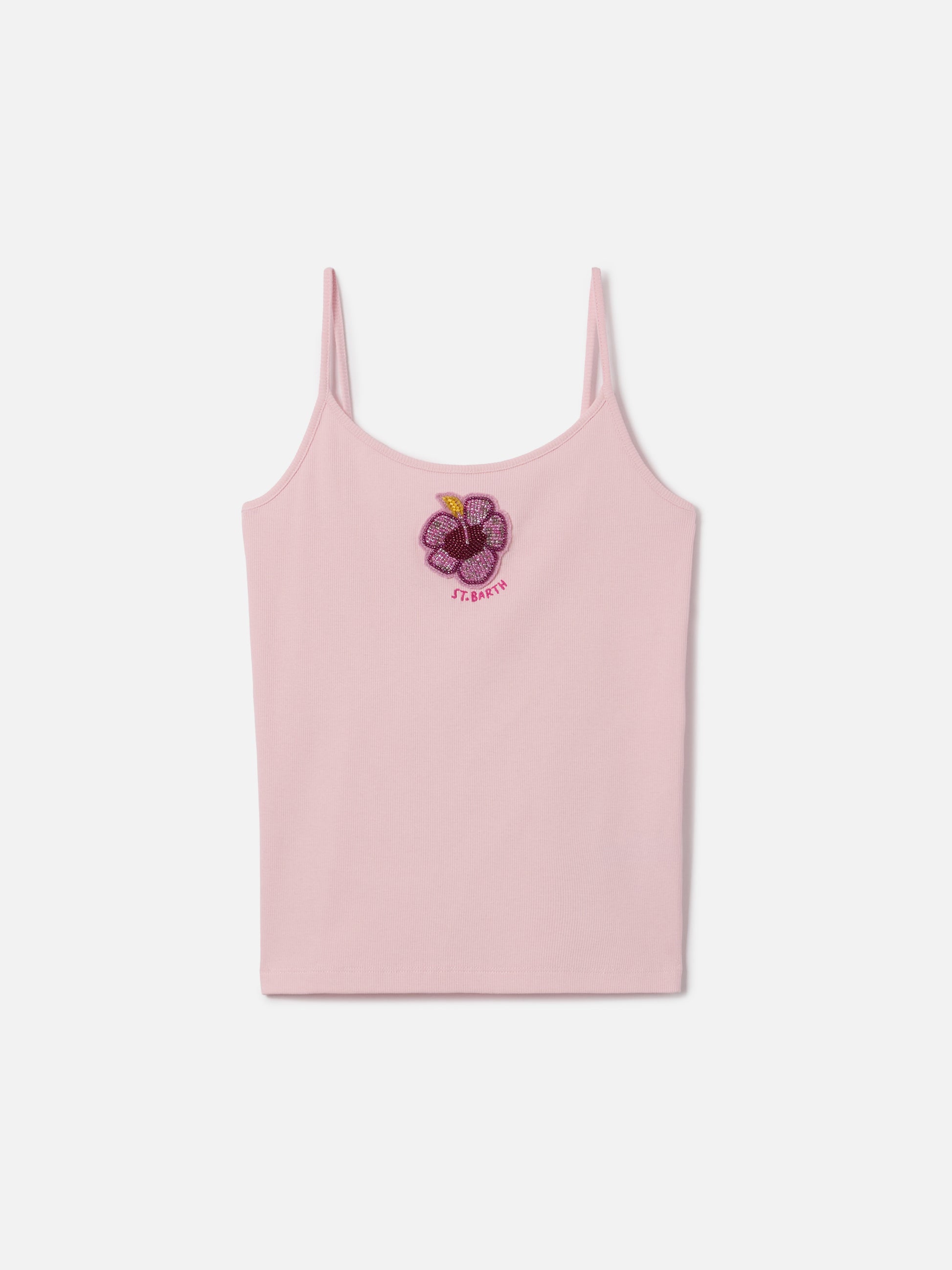 Pink Zaira tank top with embroidered logo and bead patch