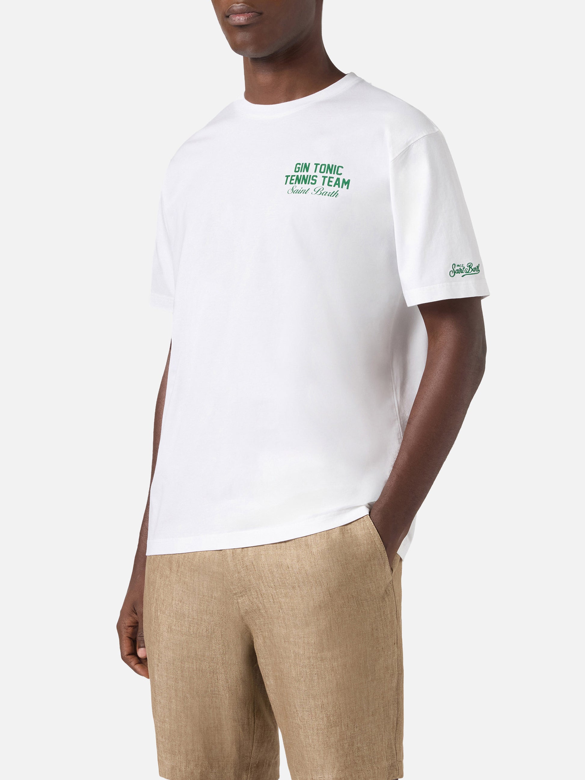 White Portland t-shirt with Gin Tonic Tennis Team illustration