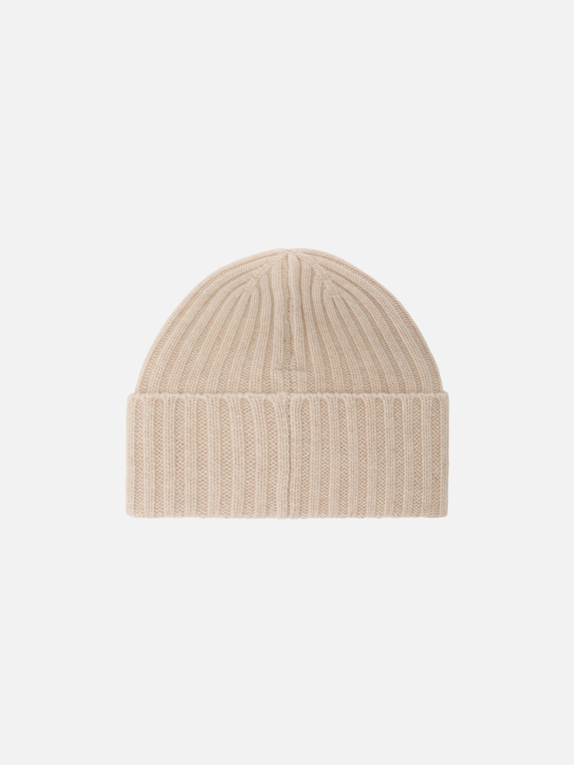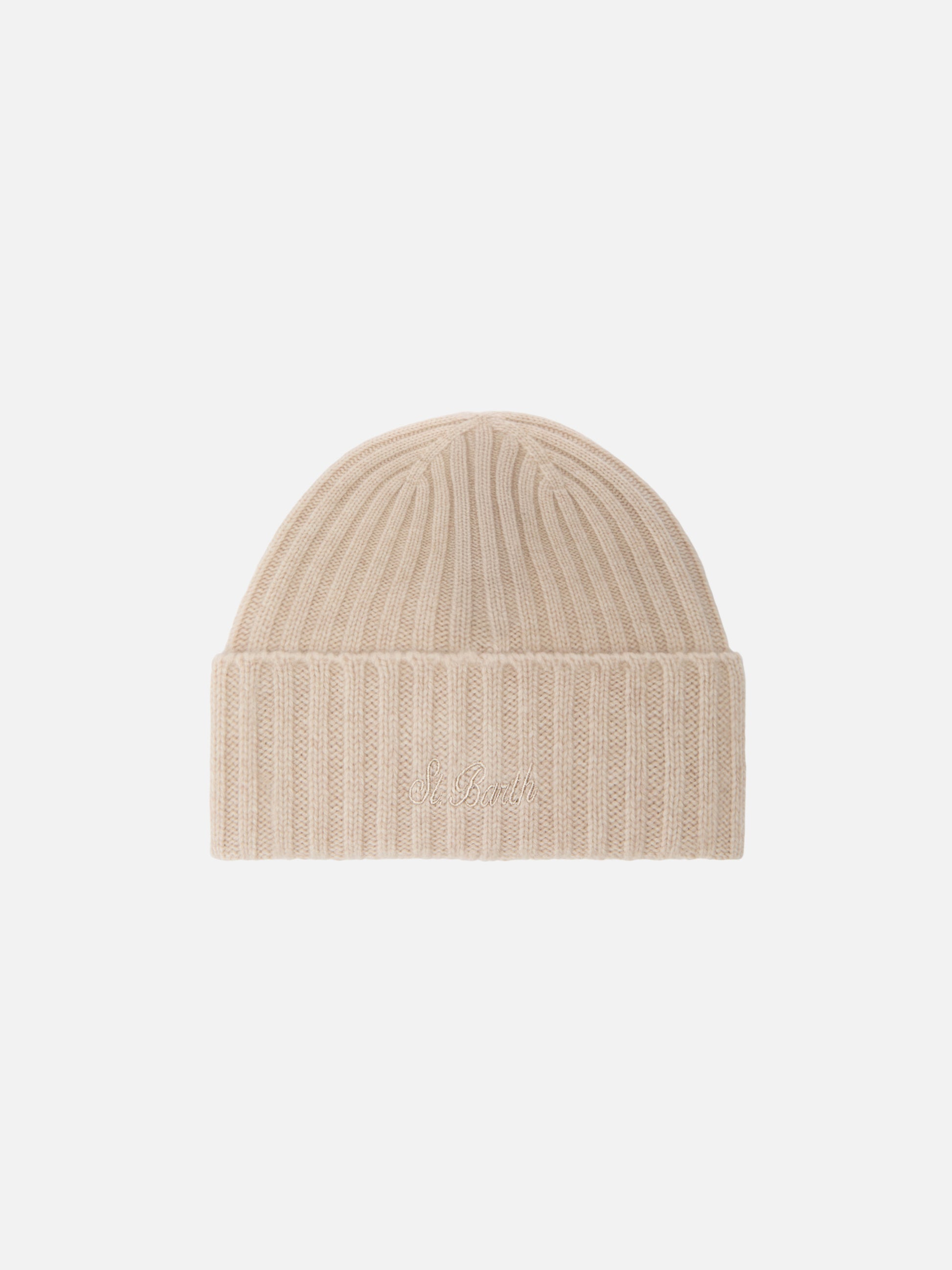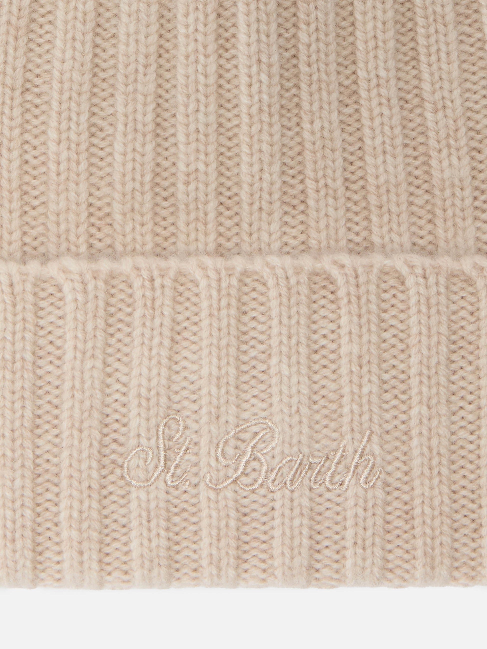 Wengen-Mütze aus beigefarbenem meliertem Kaschmir mit St. Barth-Stickerei am Umschlag