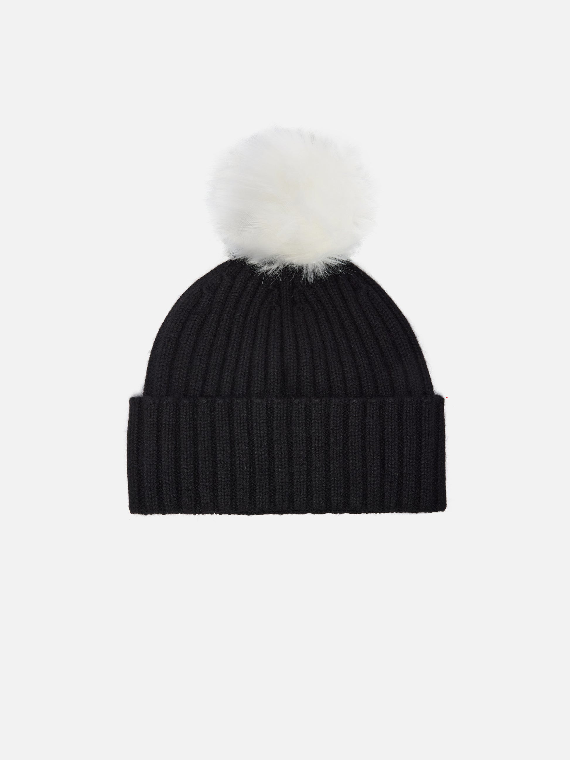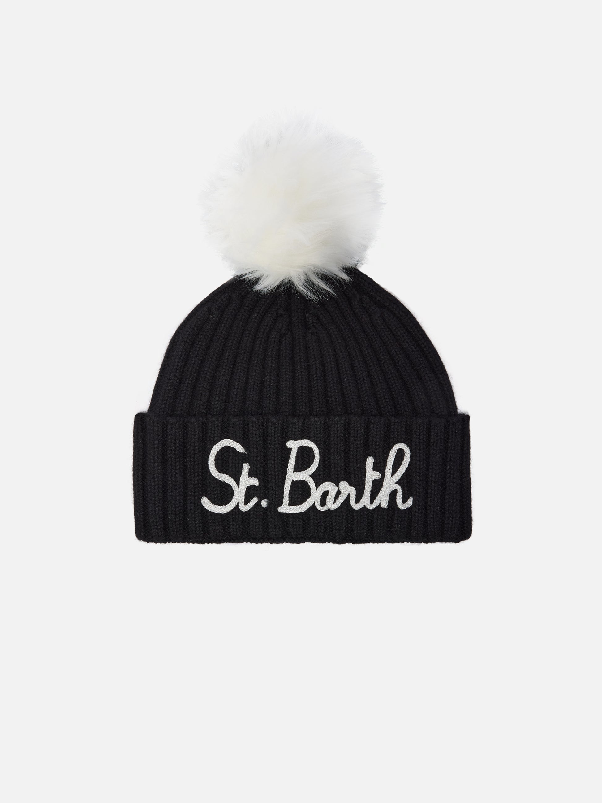 Wengen-Mütze aus Kaschmirmischung in Schwarz mit St. Barth-Stickerei und Bommel