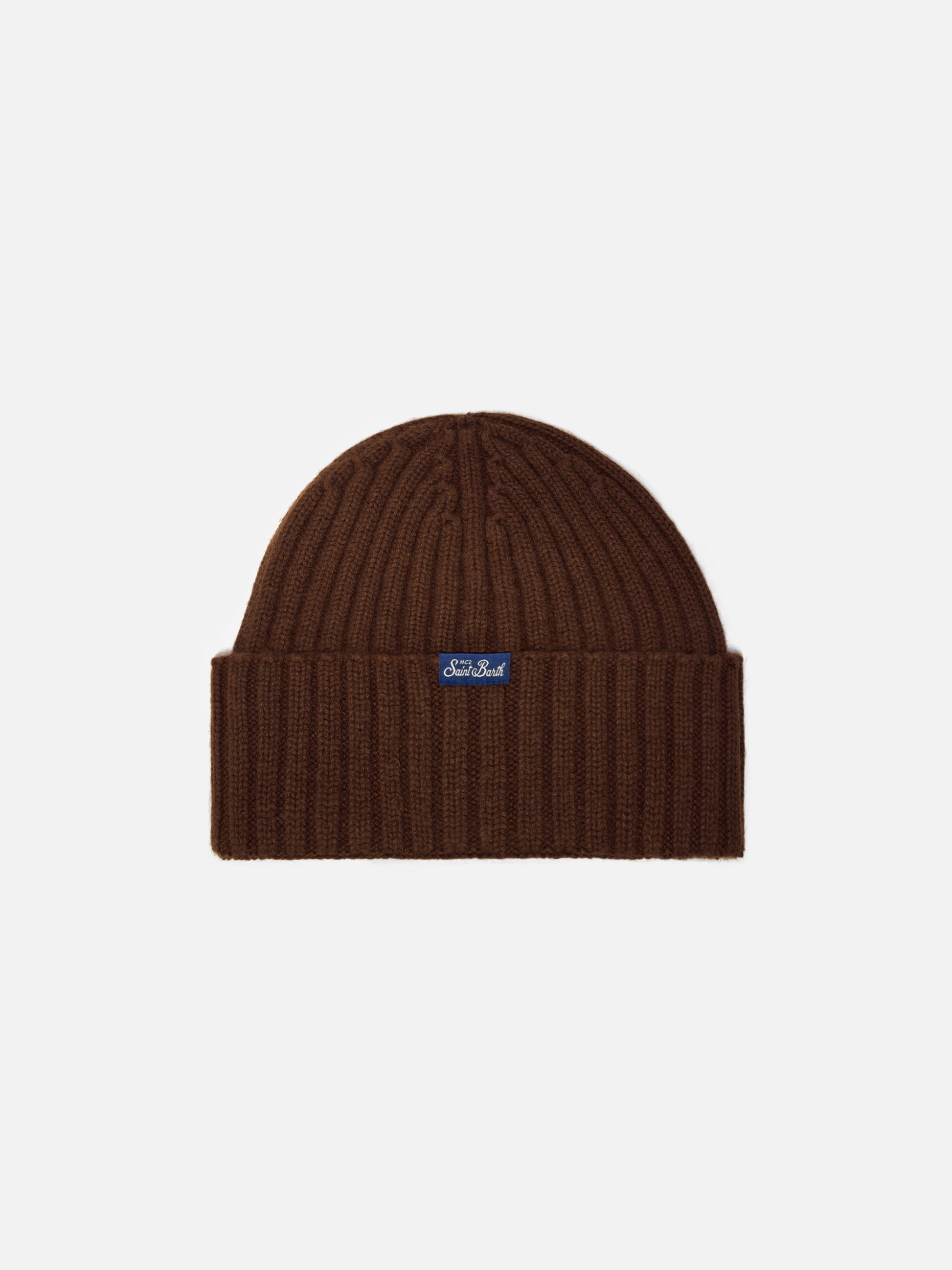 Cashmere blend Wengen beanie in brown with lurex Ski Queen embroidery