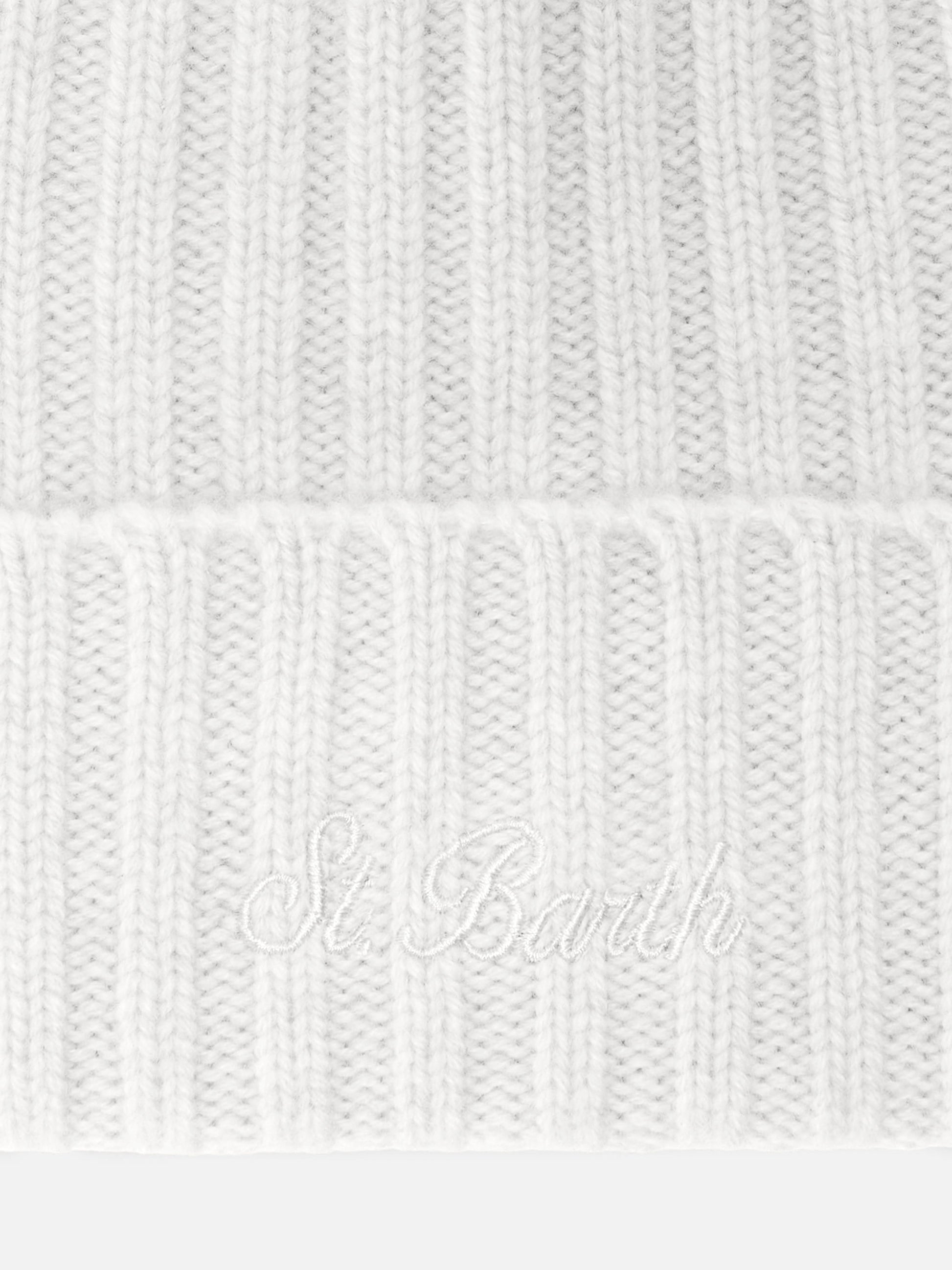Wengen-Mütze aus weißem Kaschmir mit St.-Barth-Stickerei am Umschlag