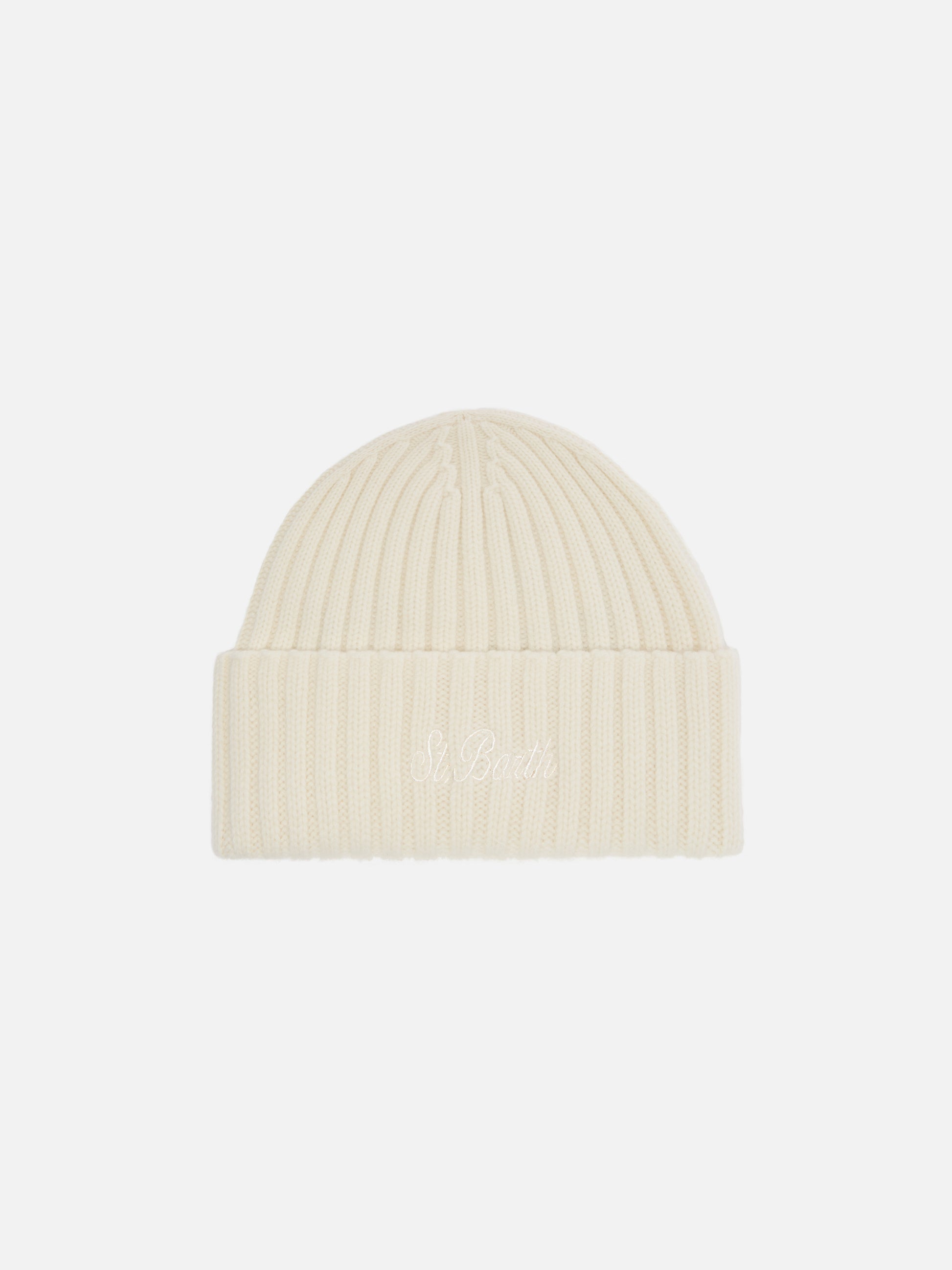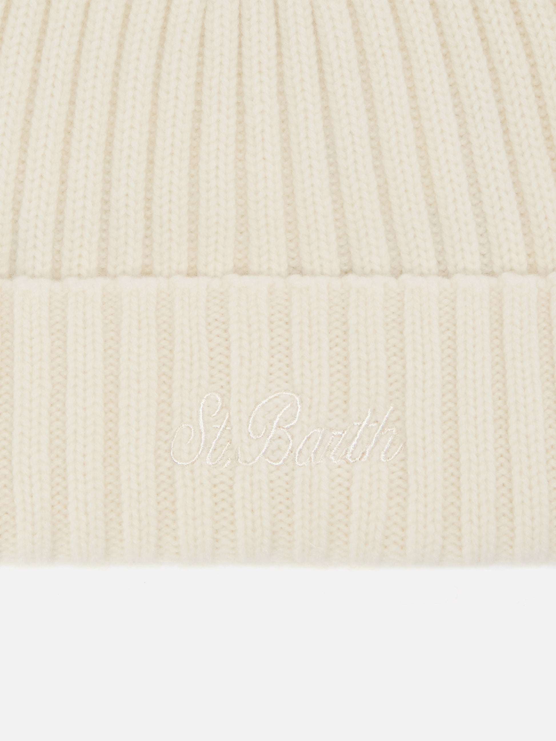 Wengen beanie in white with St. Barth embroidery on the turn-up
