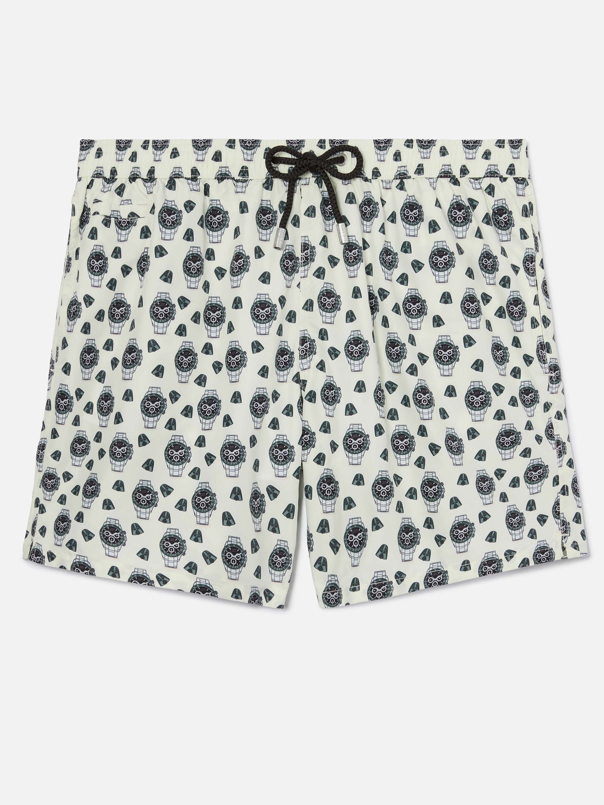 The Lighting Micro swim shorts are crafted from breathable quick-dry fabric designed to provide comfort and freedom of movement. The black and white design features a watch in the night all-over print with watches and dark stones creating a bold and contemporary graphic contrast. The elasticated waistband with drawstring allows an adjustable fit, while the elasticated antibacterial inner mesh ensures comfort. The style features a mid-length cut and a regular fit.
