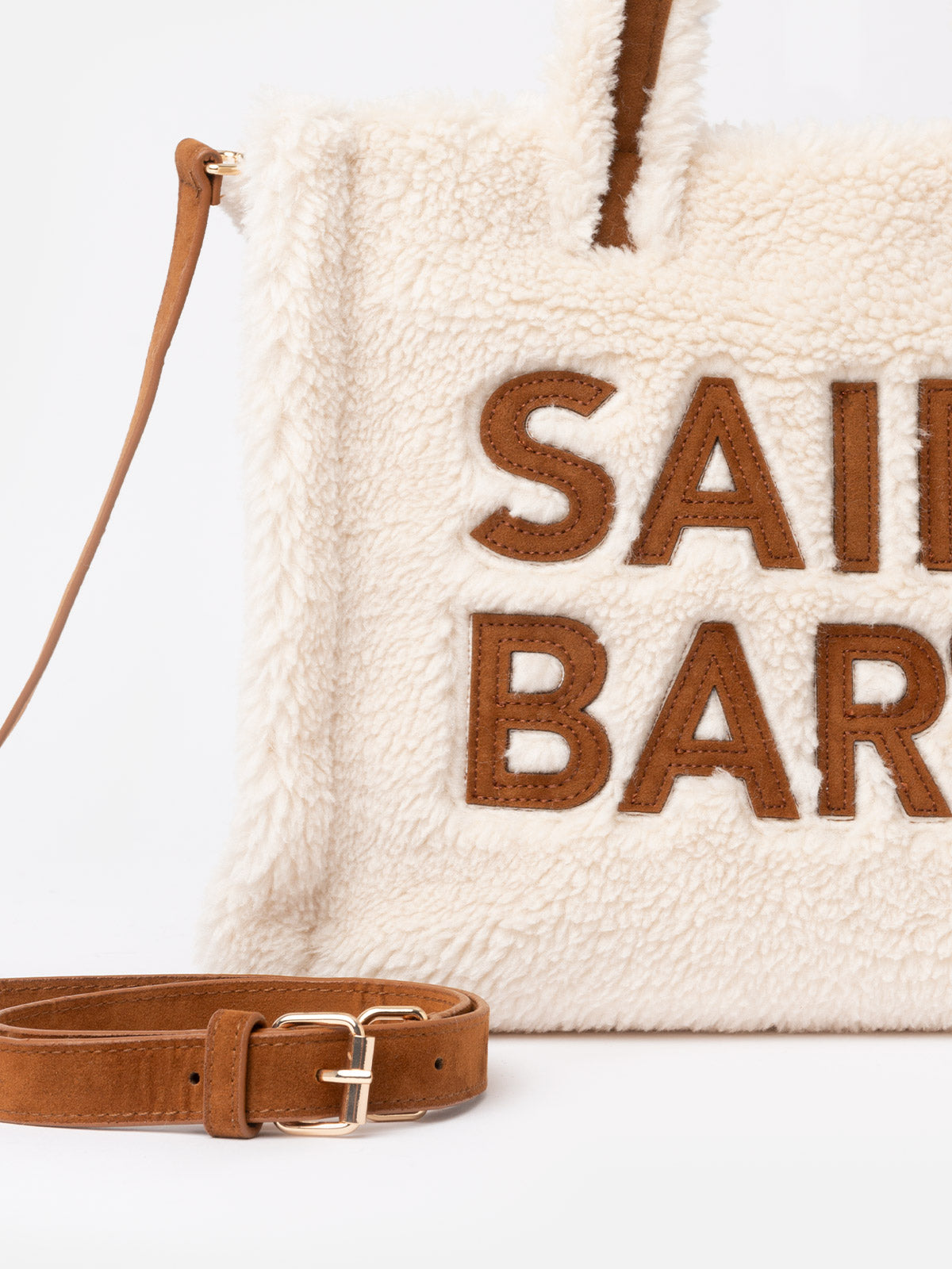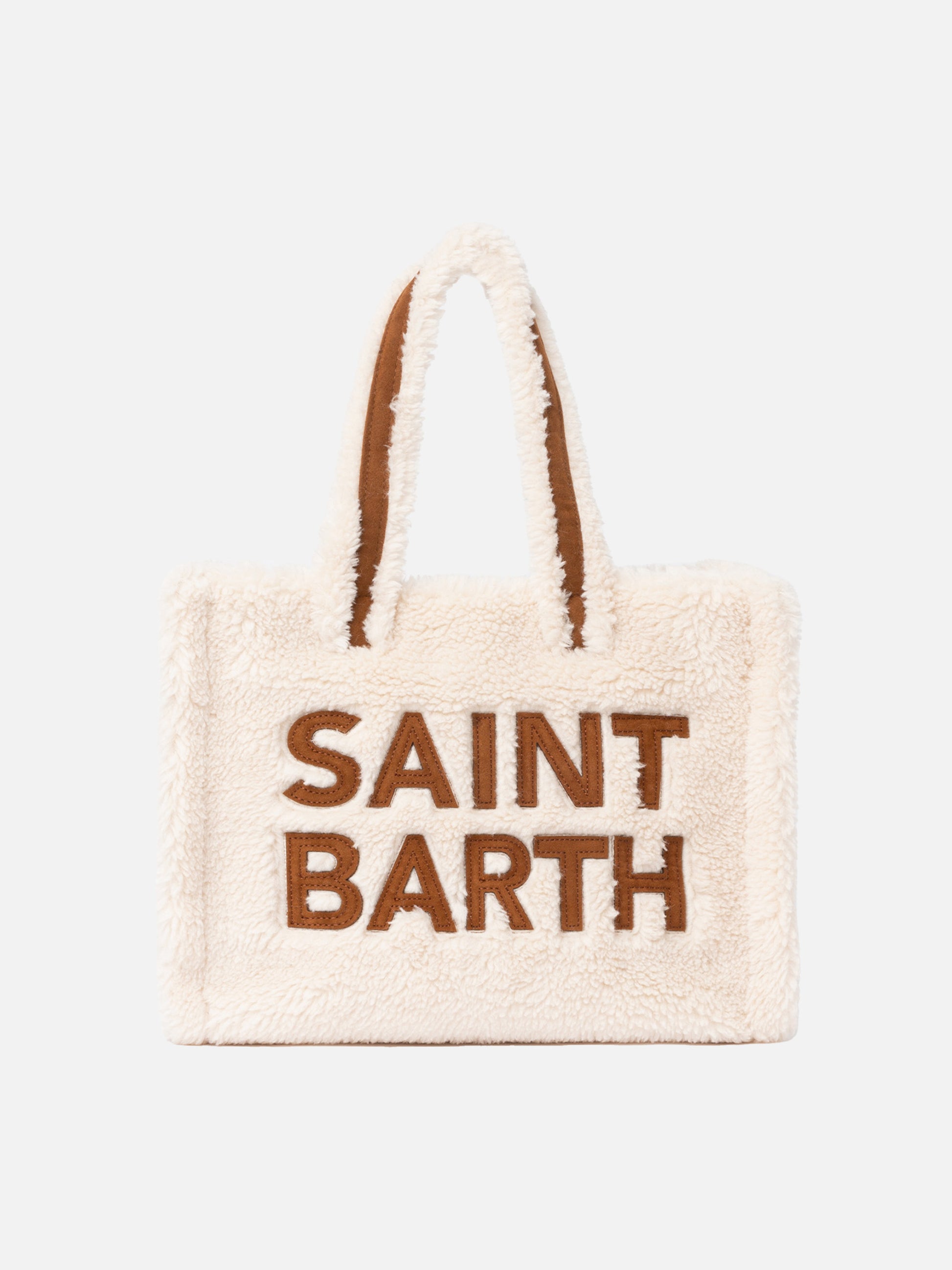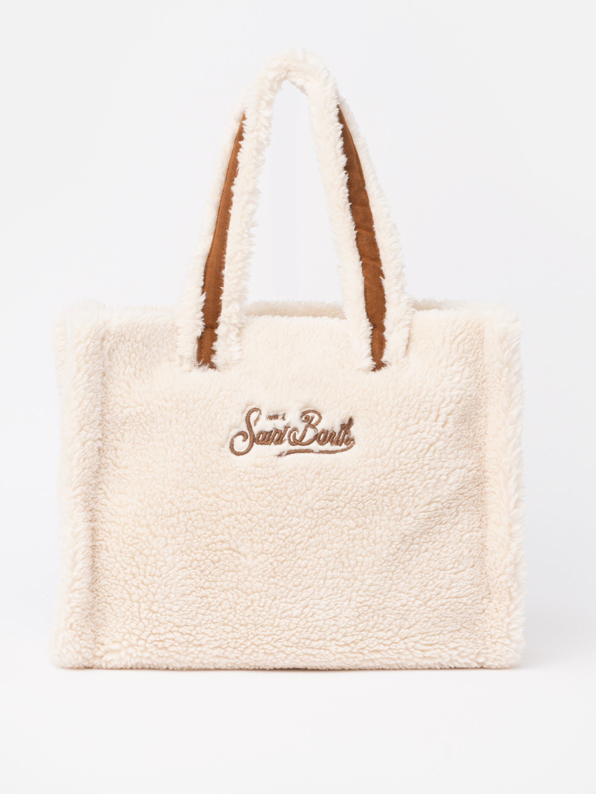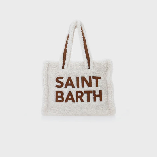 Weiße Soft Bag Small aus Teddyfell mit Saint Barth-Logo und Schultergurt