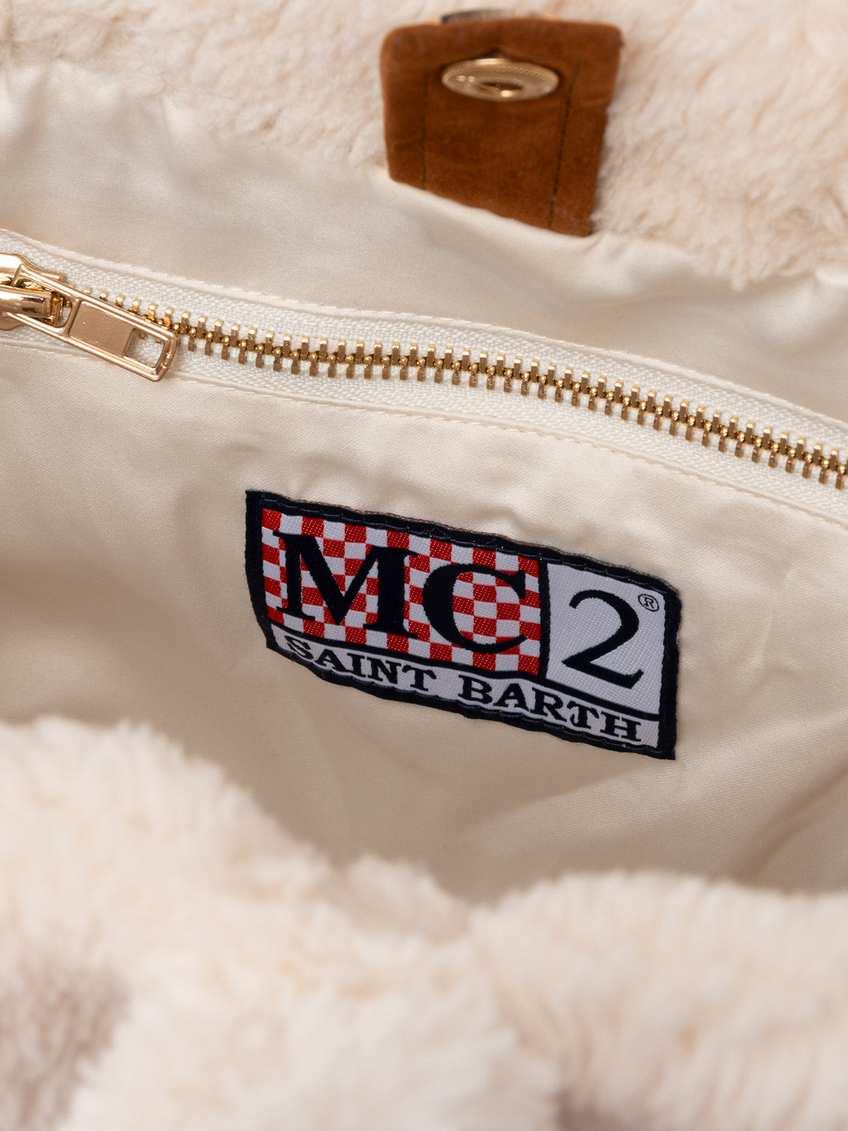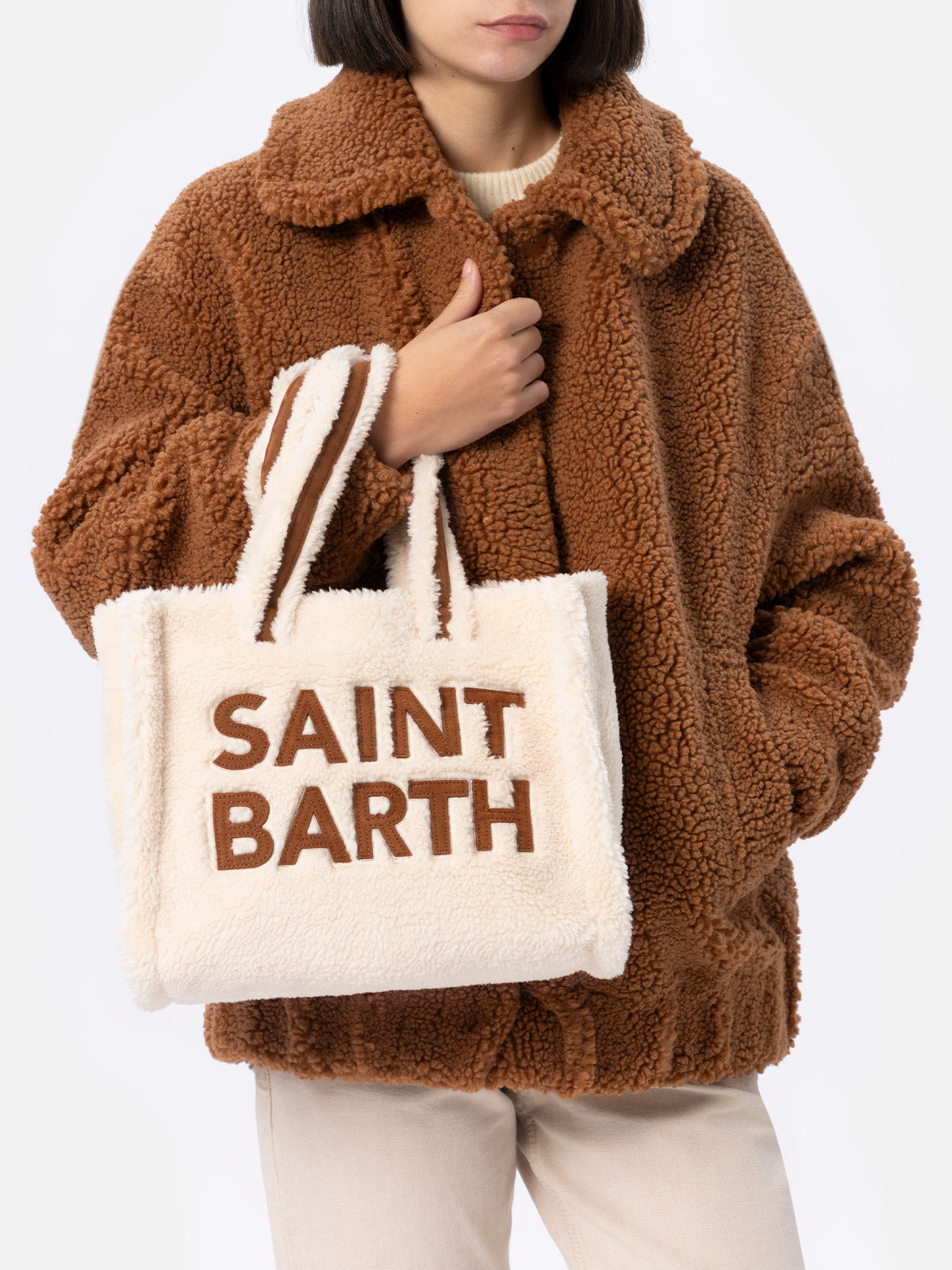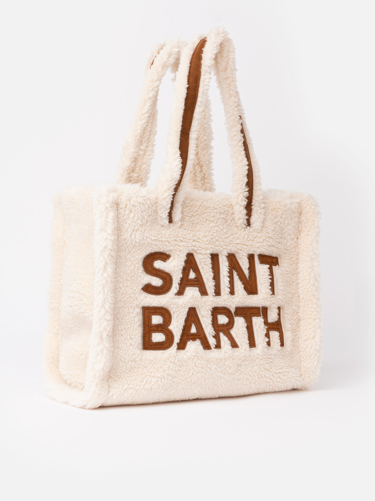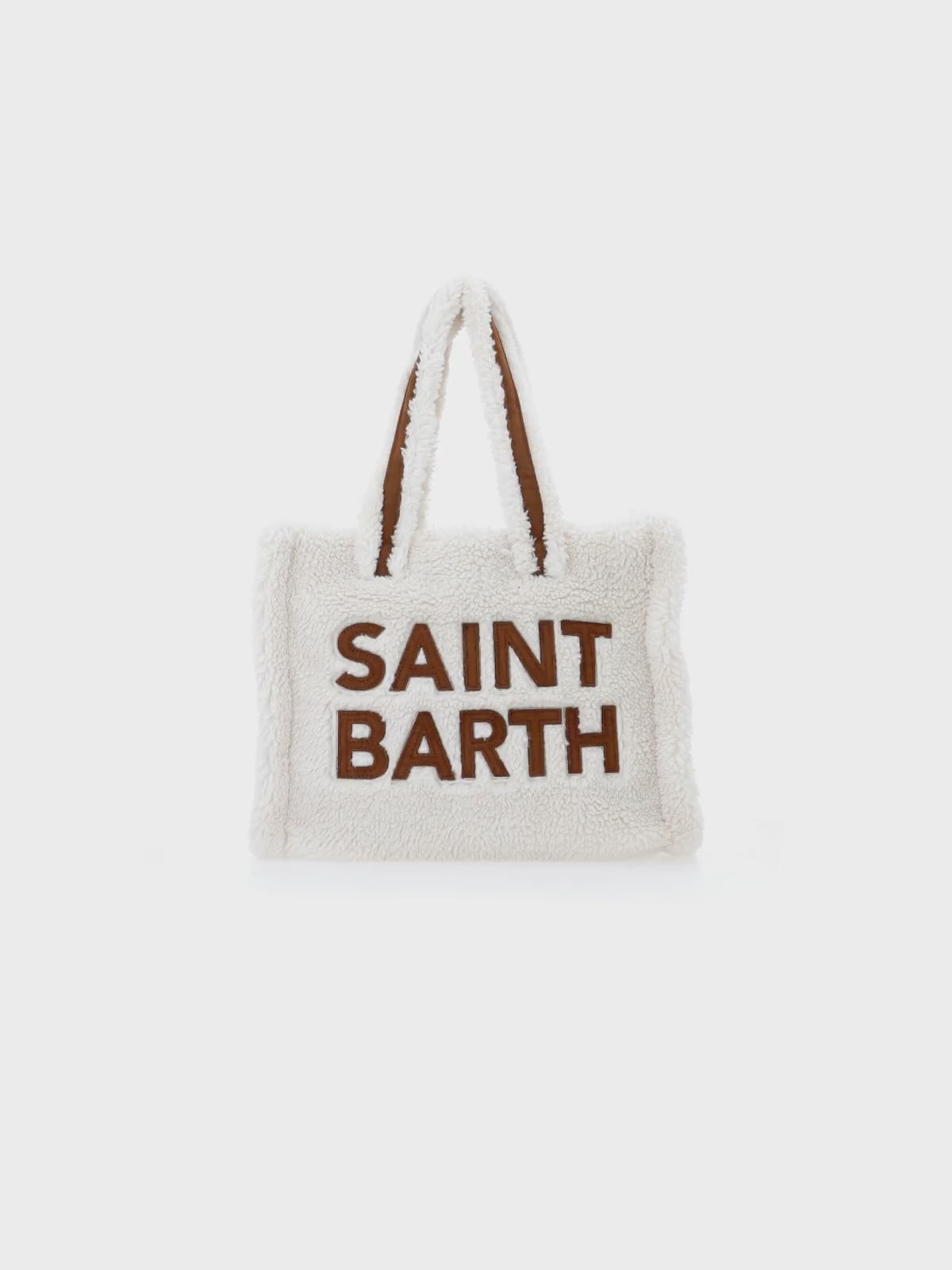 Weiße Soft Bag Small aus Teddyfell mit Saint Barth-Logo und Schultergurt
