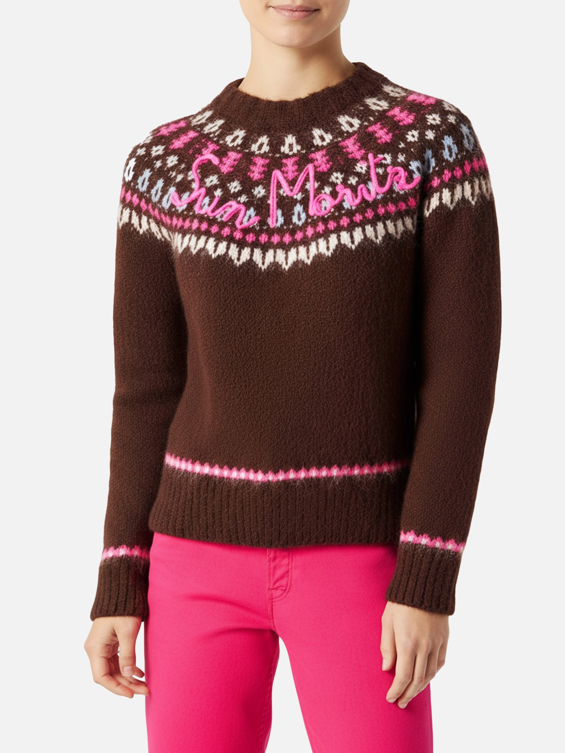Brauner Damen-Rundhalspullover aus nordischem Jacquard