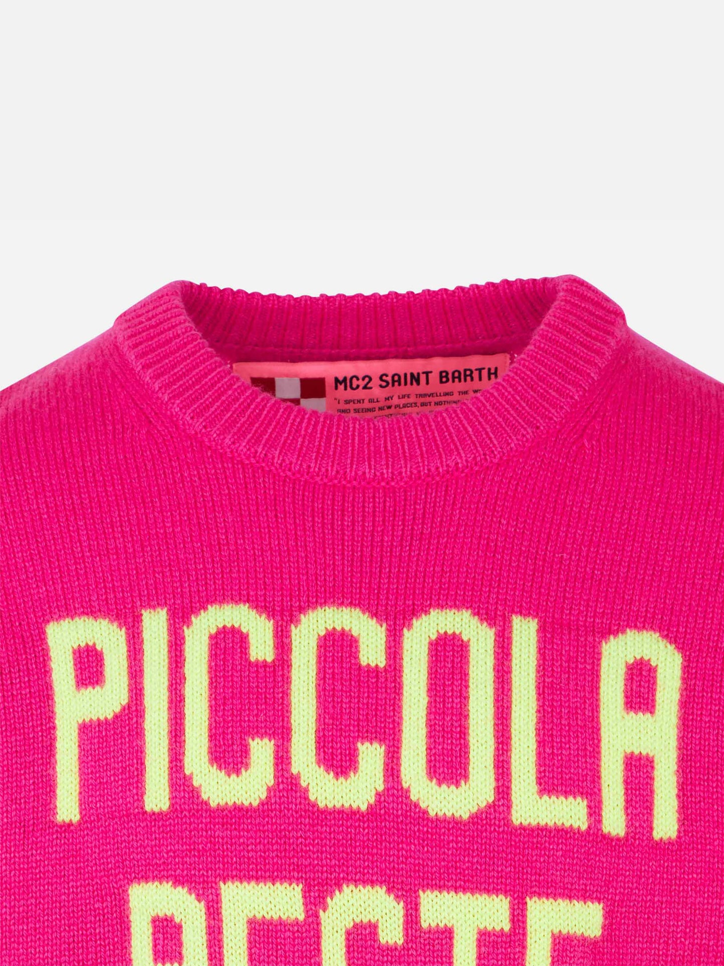 Maglione rosa fluo da bambina ricamo Piccola Peste giallo fluo