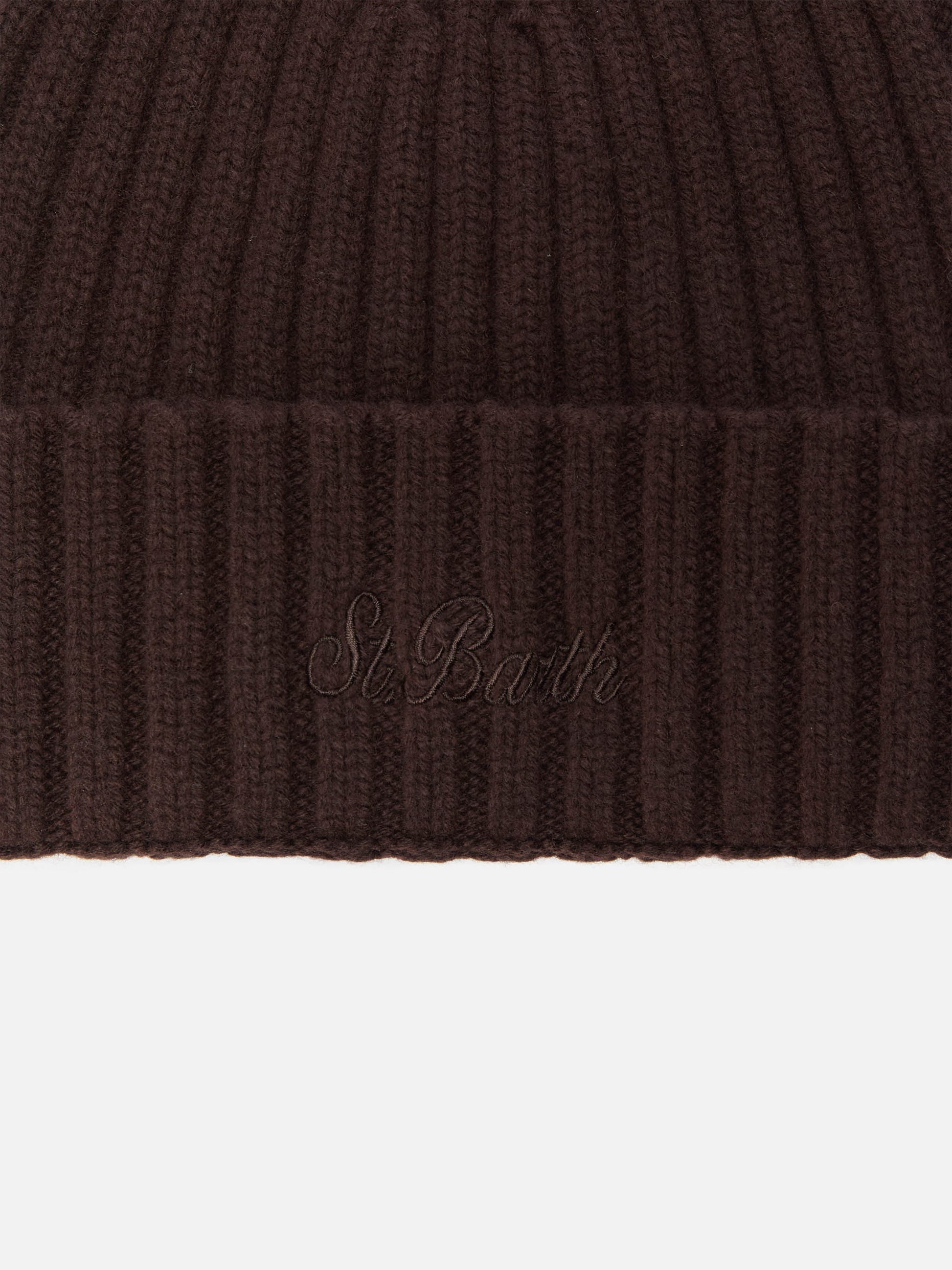 Berretto Wengen in lana marrone con ricamo St. Barth sul risvolto