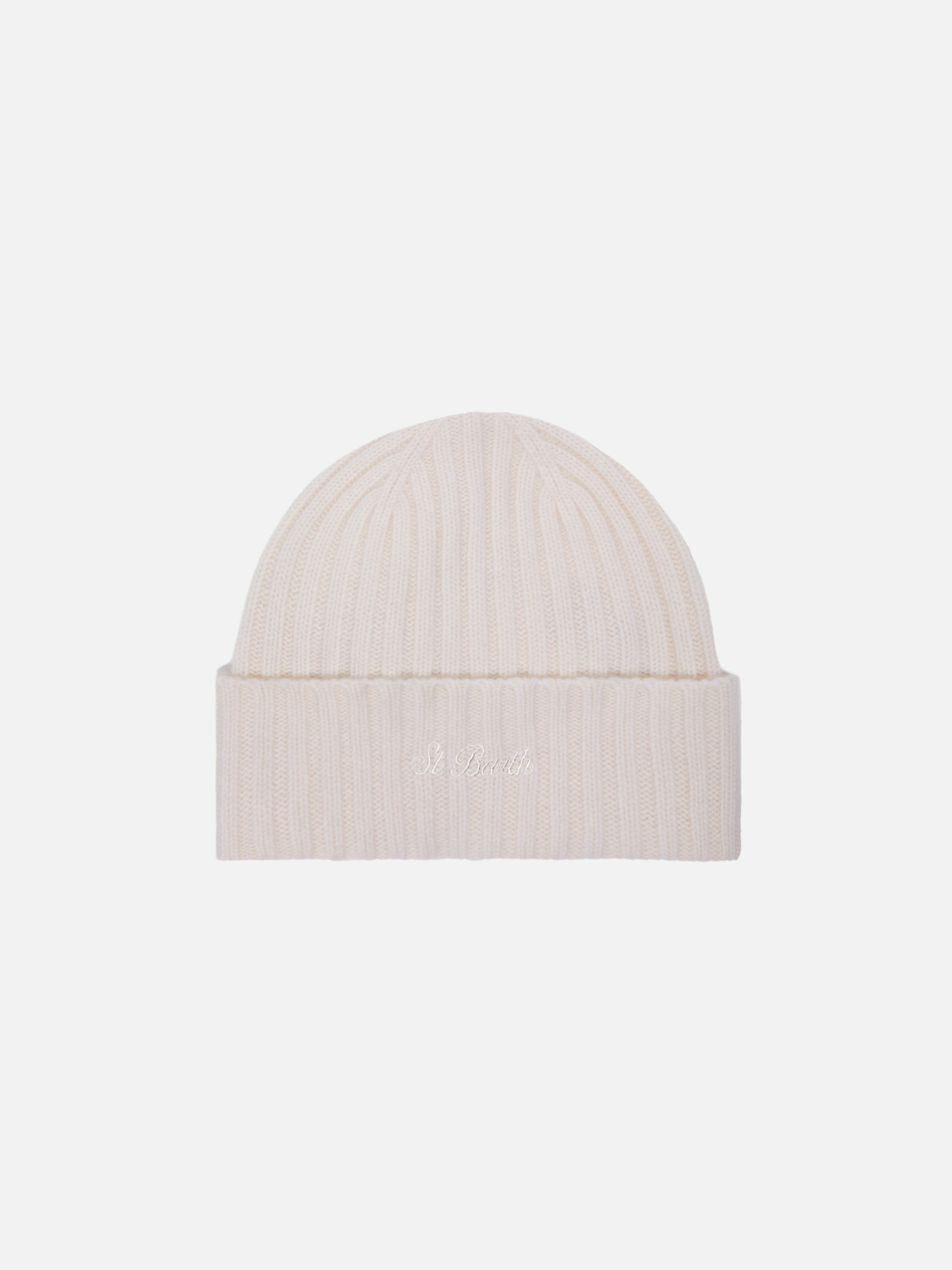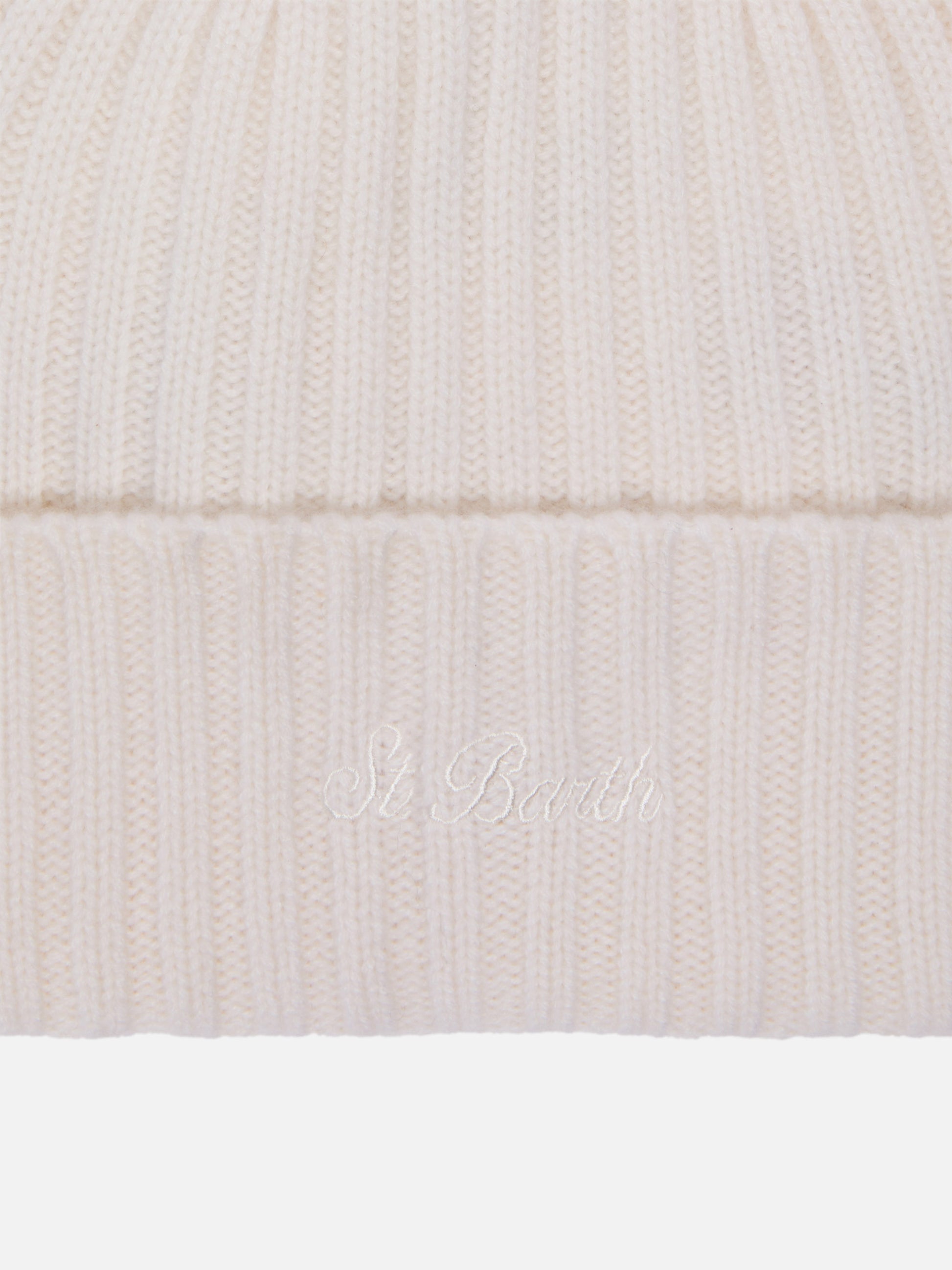 Berretto Wengen in cashmere bianco con ricamo St. Barth sul risvolto