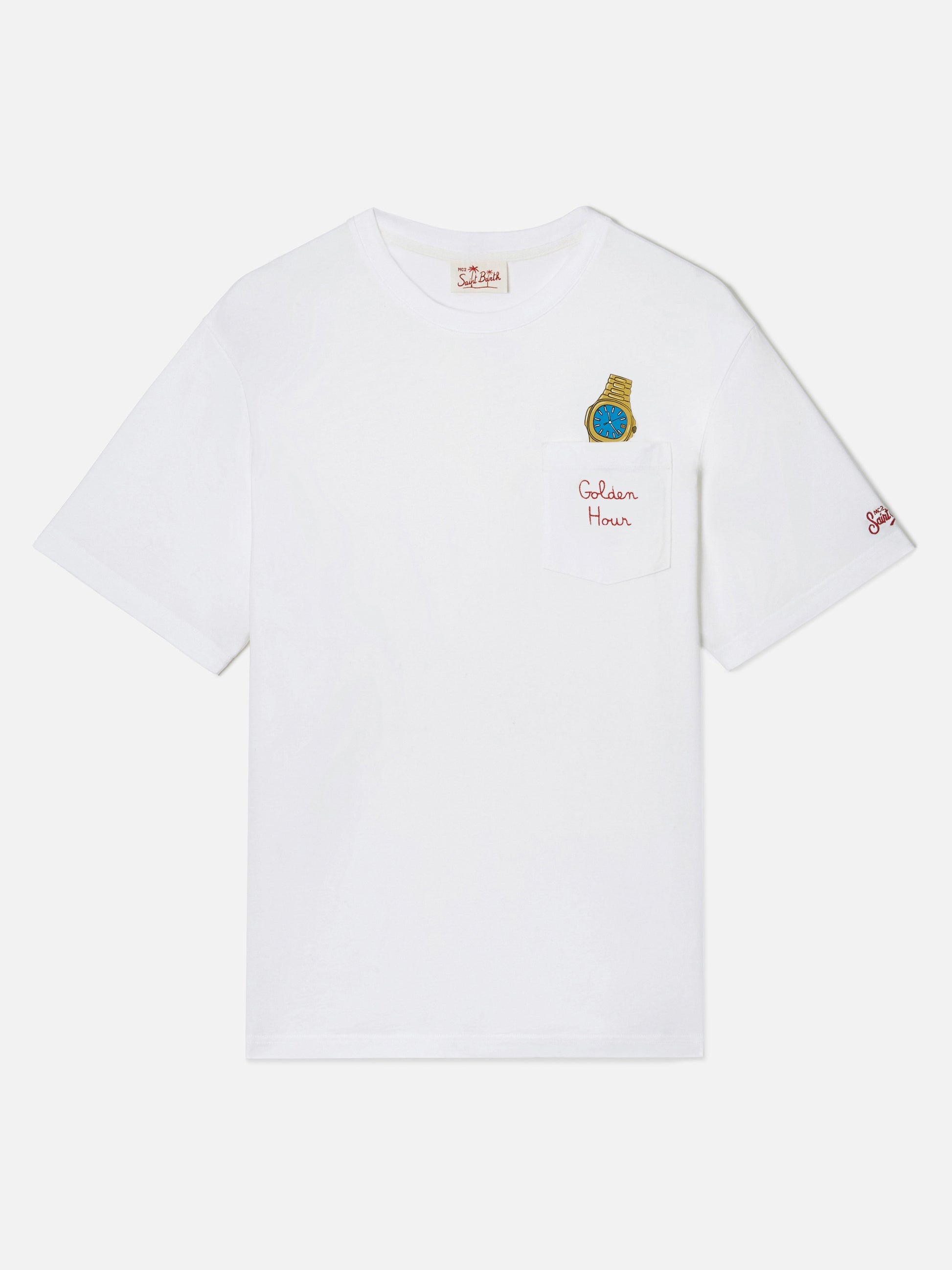https://it.mc2saintbarth.com/it/products/white-austin-t-shirt-with-watch-and-golden-hour-embroidery10775855792474T-shirt Austin bianca con orologio e ricamo Golden Hour69.00https:files/UID_AUS000101981L-MAN-T-SHIRT-WHITE-MC2-MC2_4.jpghttps:files/UID_AUS000101981L-MAN-T-SHIRT-WHITE-MC2-MC2_4.jpgEURInStockT-SHIRT650948215130All Products - Only Man649134276954AVADA - Best Sellers621710016858Passione Orologi628412809562Small Embroidery T-shirts288164774072T-Shirt Uomo654690484570UpSelling_Man_T-shirts654690746714UpSelling_Man_T-shirts-Watches647428079962Watch Collection Small EmbroideriesLa t-shirt Austin è realizzata in puro cotone, progettata per offrire comfort e una sensazione naturale sulla pelle. Il design bianco tinta unita valorizza la costruzione essenziale del capo. Il modello presenta un taschino sul petto con ricamo a contrasto Golden Hour ed è completato da un’illustrazione di un orologio. Il capo è rifinito dal ricamo St. Barth. Il modello presenta scollo a girocollo, maniche corte e linea dritta con vestibilità regolare.