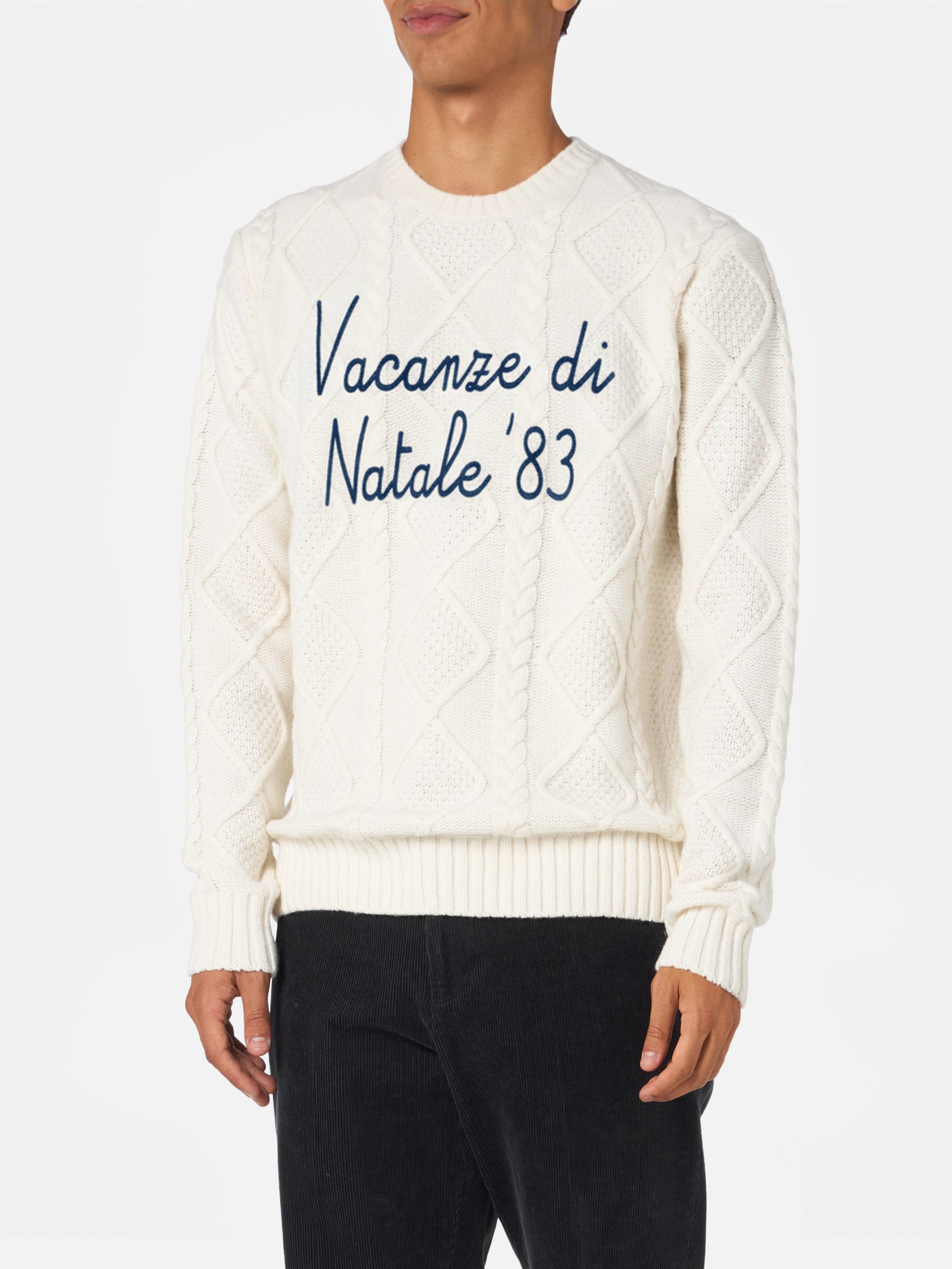Maglione bianco a girocollo Bergen Tricot con ricamo Vacanze di Natale '83