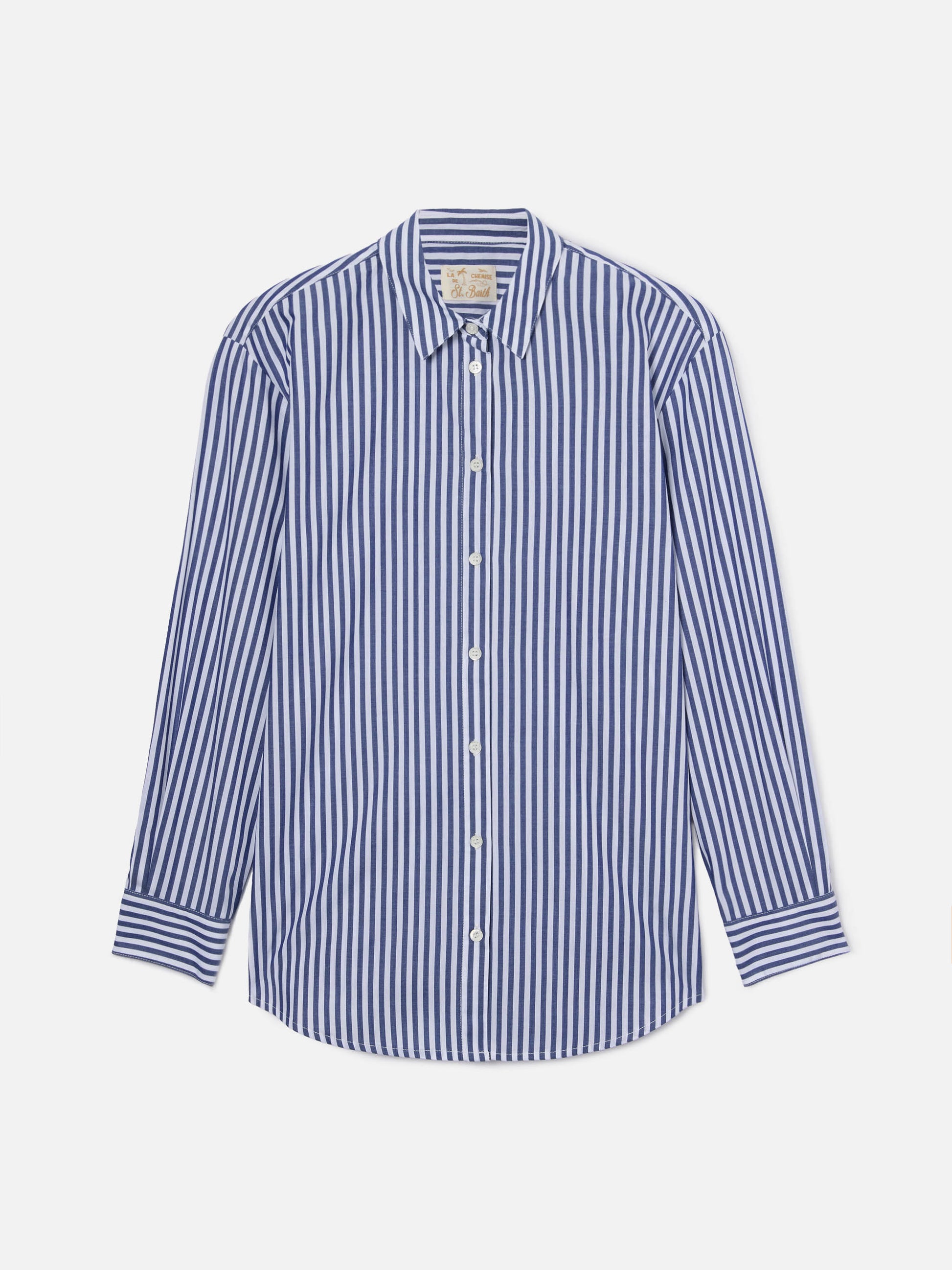 Brigitte shirt with blue stripes and See You In Saint Barth embroidery