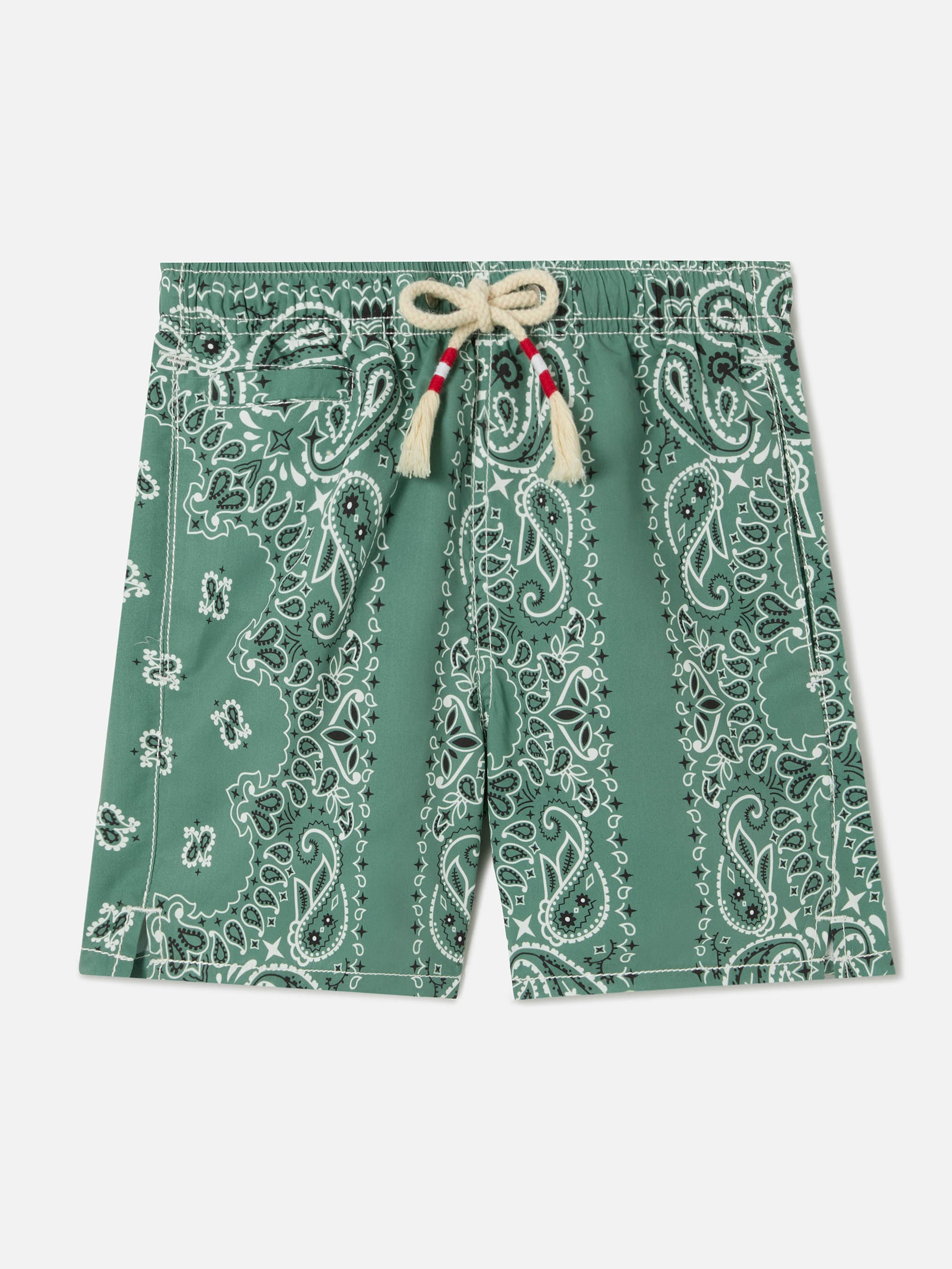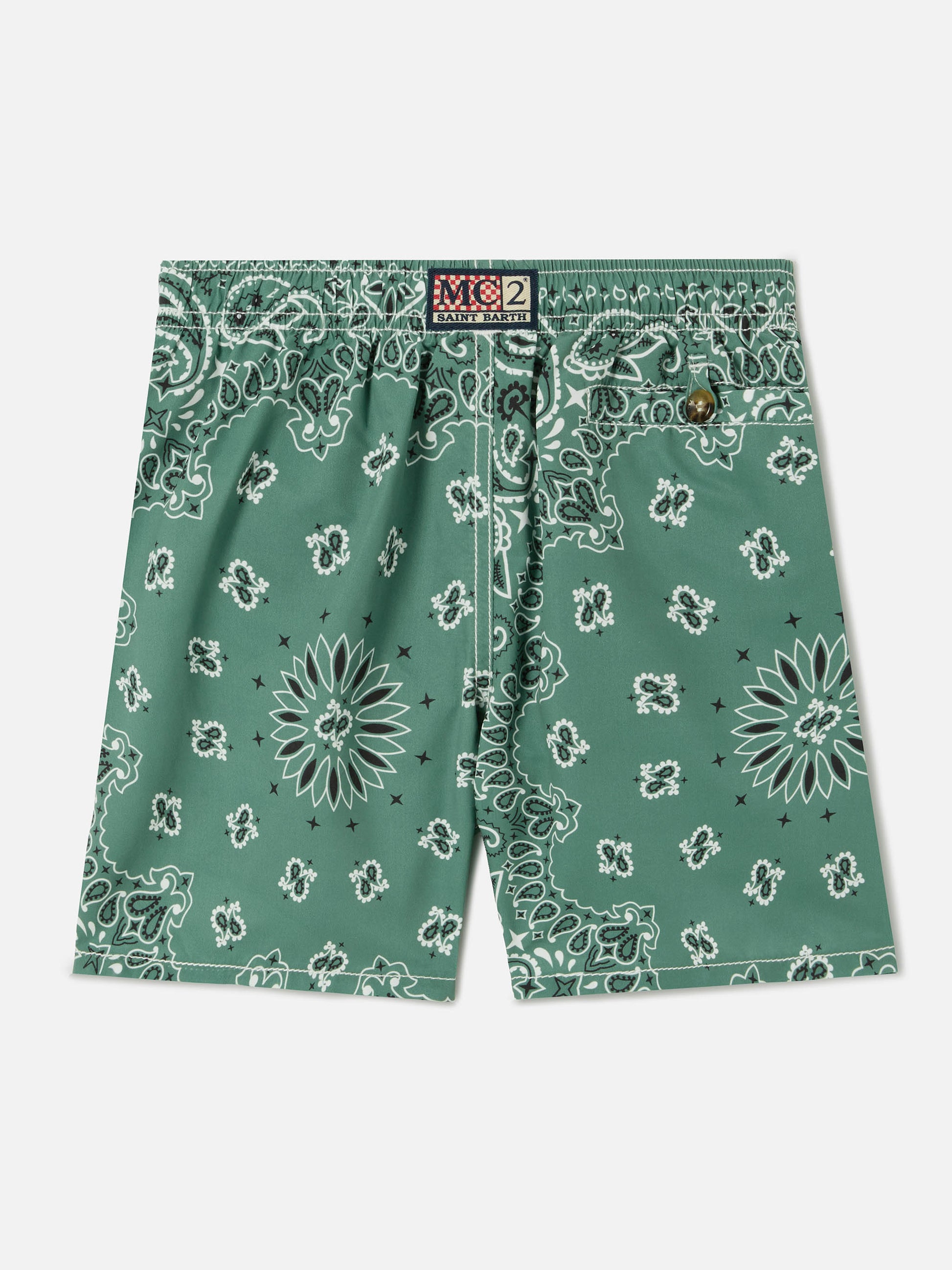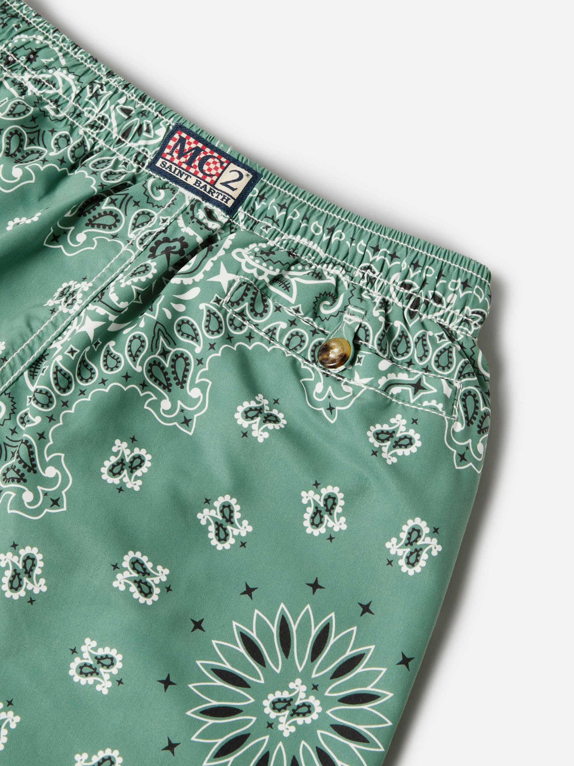 Caprese Jr boys swim shorts Military Green Bandana print Lightweight and breathable fabric Elasticated waistband with adjustable frayed drawstring Two side pockets Back pocket with branded button Front coin pocket Reinforced side slits Nickel-free metallic details