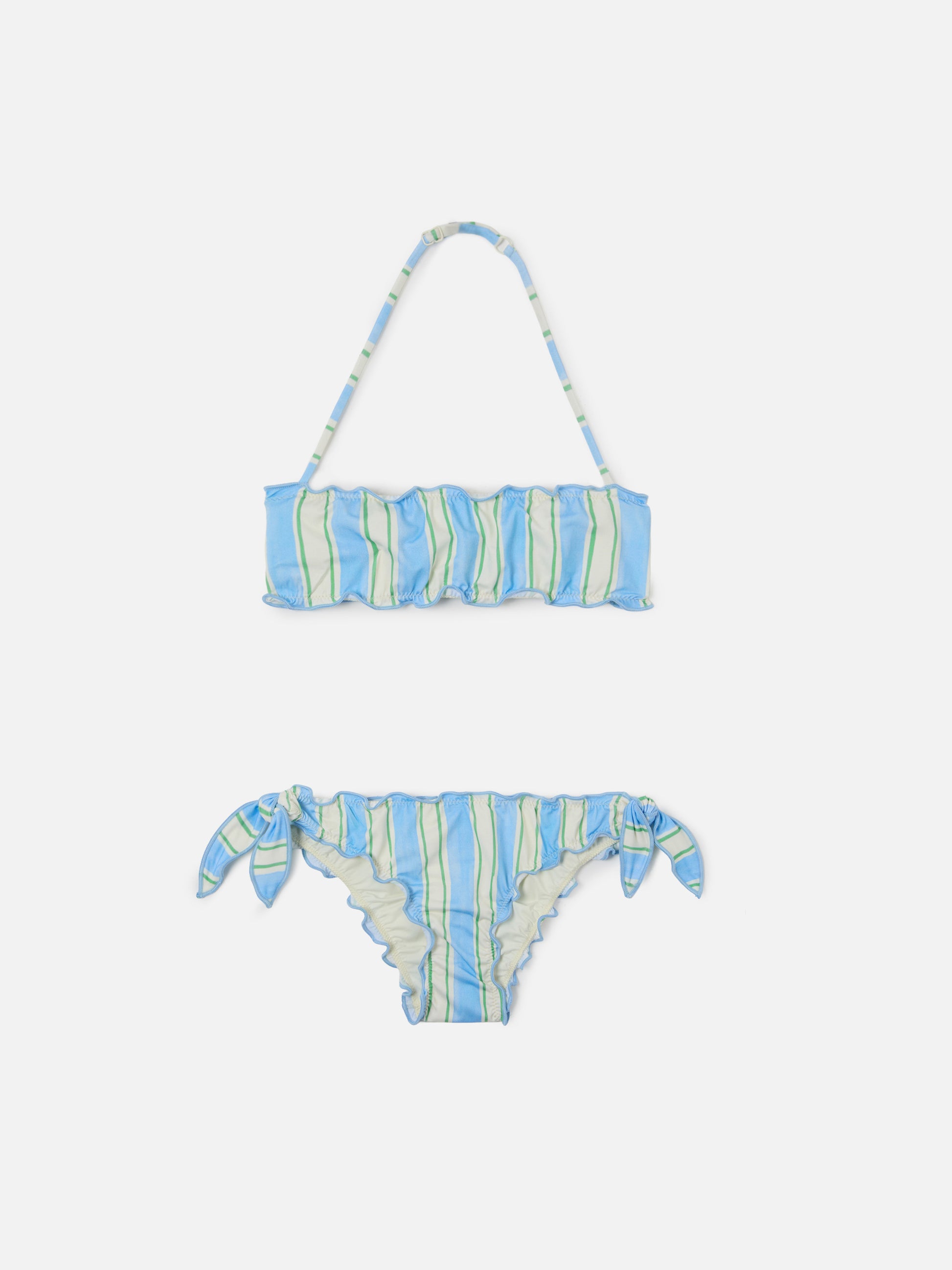 Emy white, light blue and green striped bikini with ruffled edges