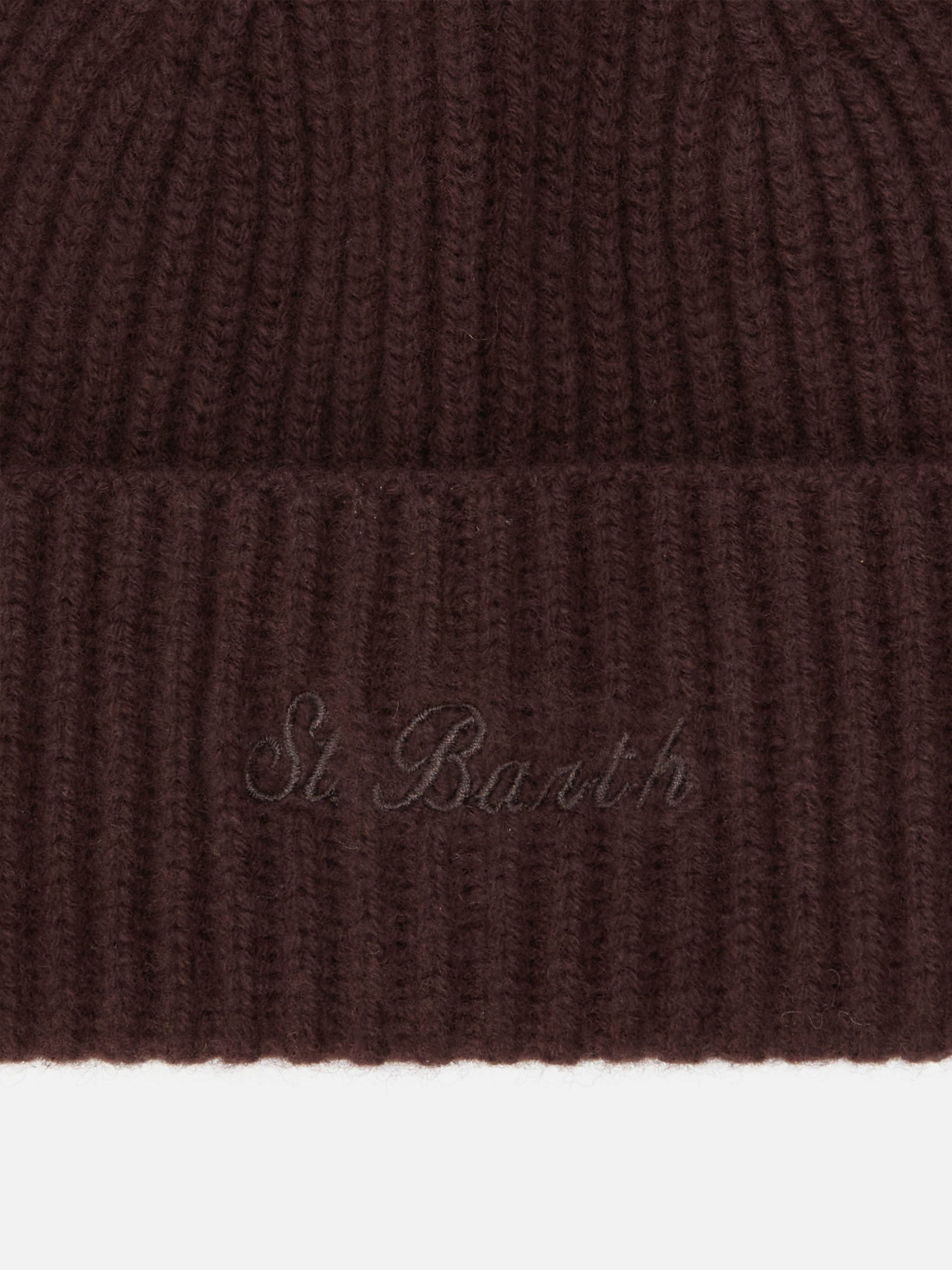 Moss Beanie in brown ribbed knit with St. Barth embroidery