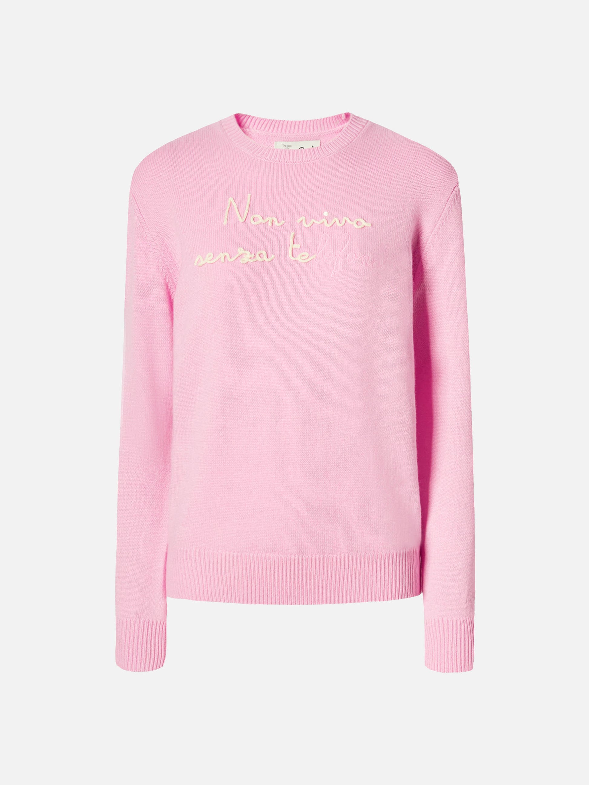 New Queen cashmere-blend sweater in pink with Non vivo senza te(lefono) embroidery