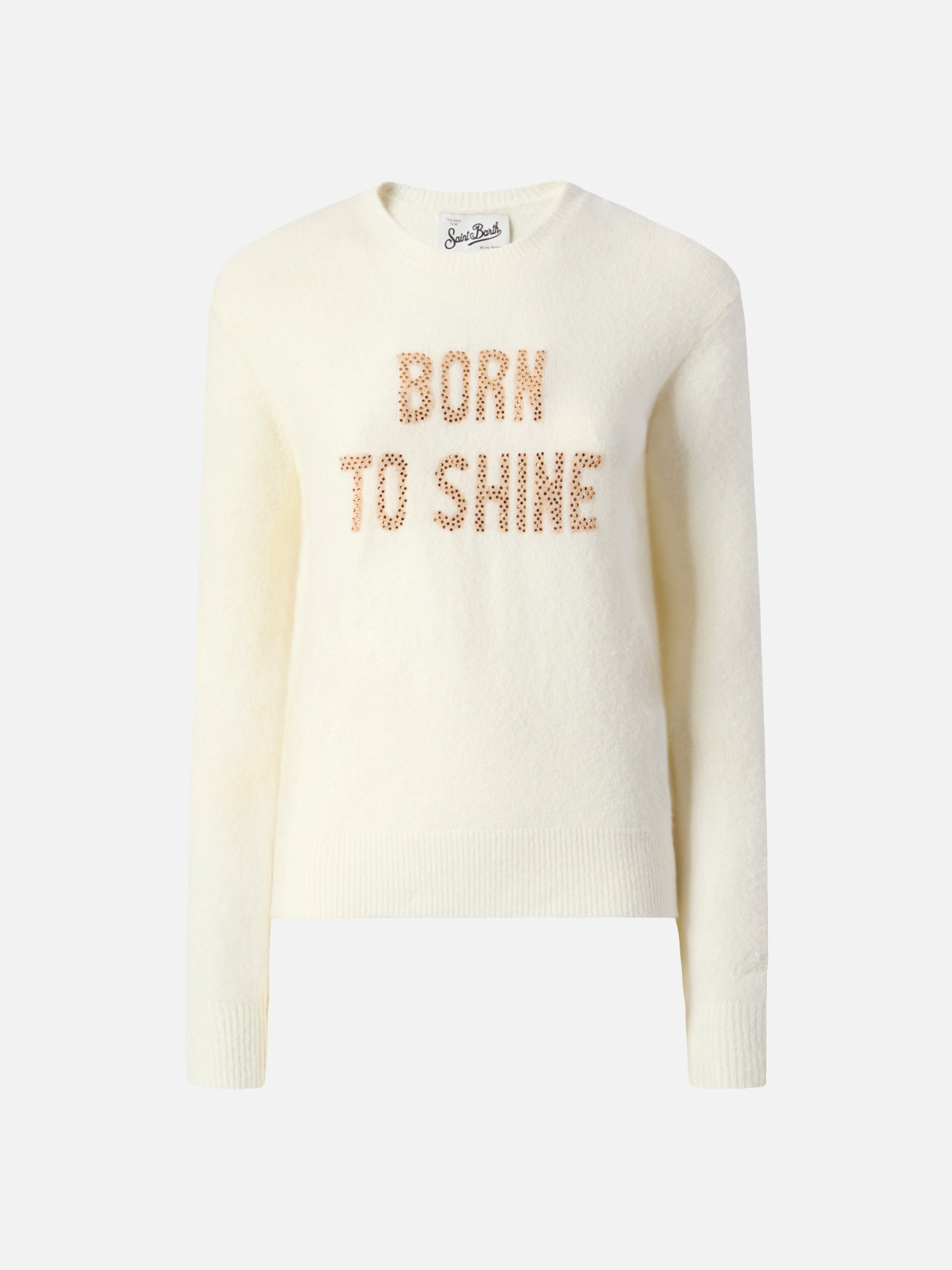 New Queen stretch sweater in merino-wool and alpaca blend in white with Born to Shine rhinestone appliqué