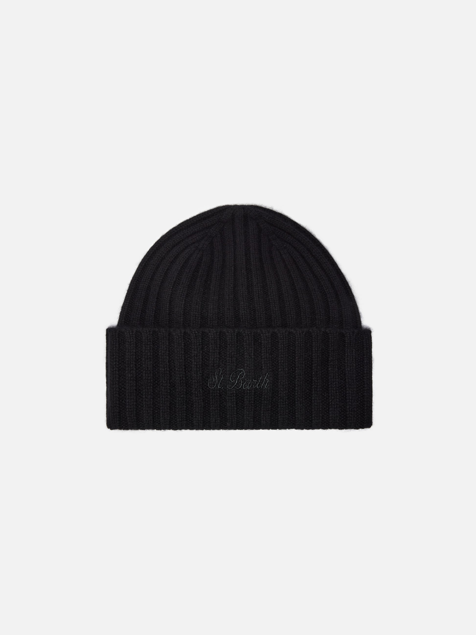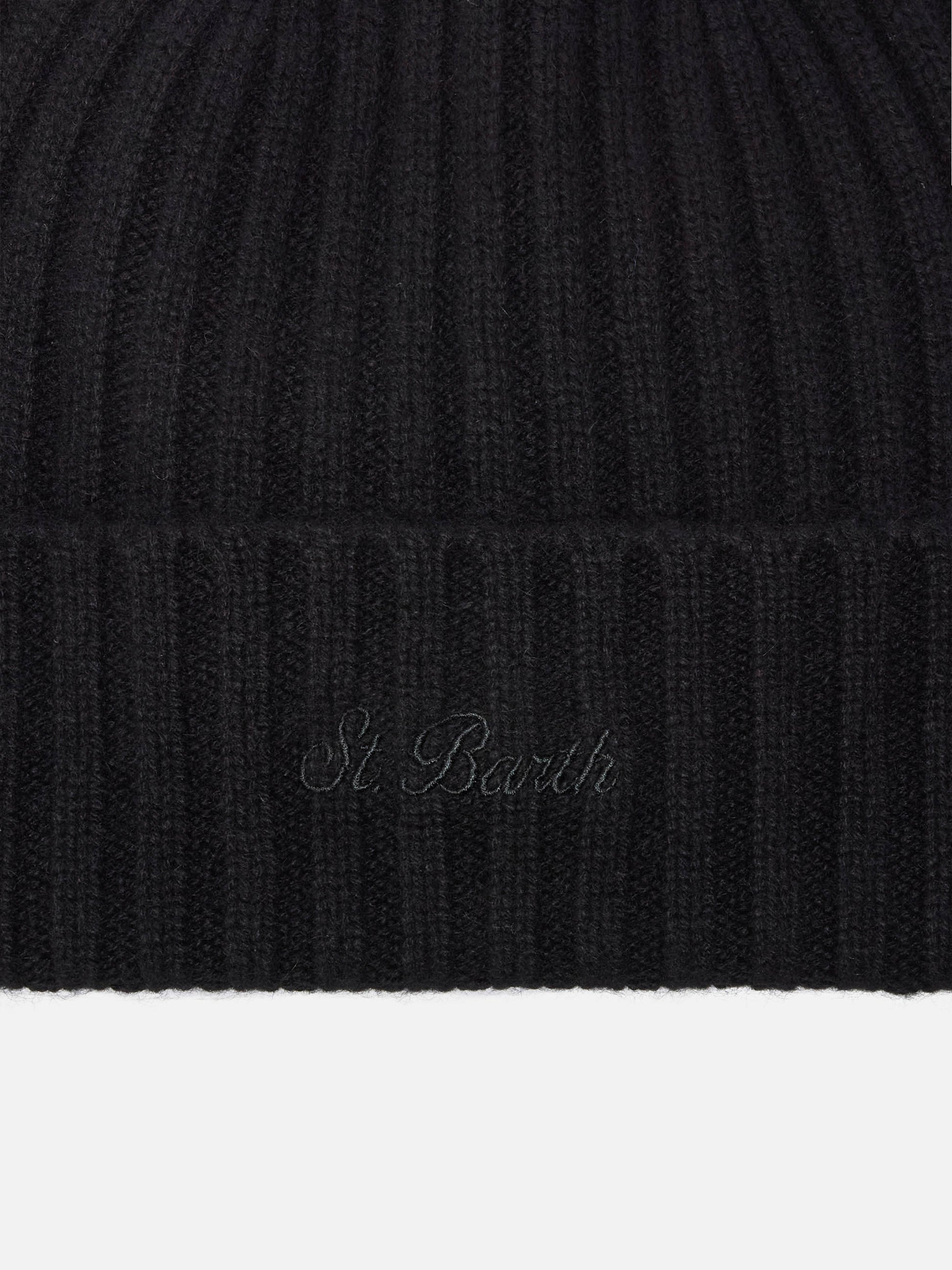 Wengen beanie in cashmere in black with St. Barth embroidery on the turn-up